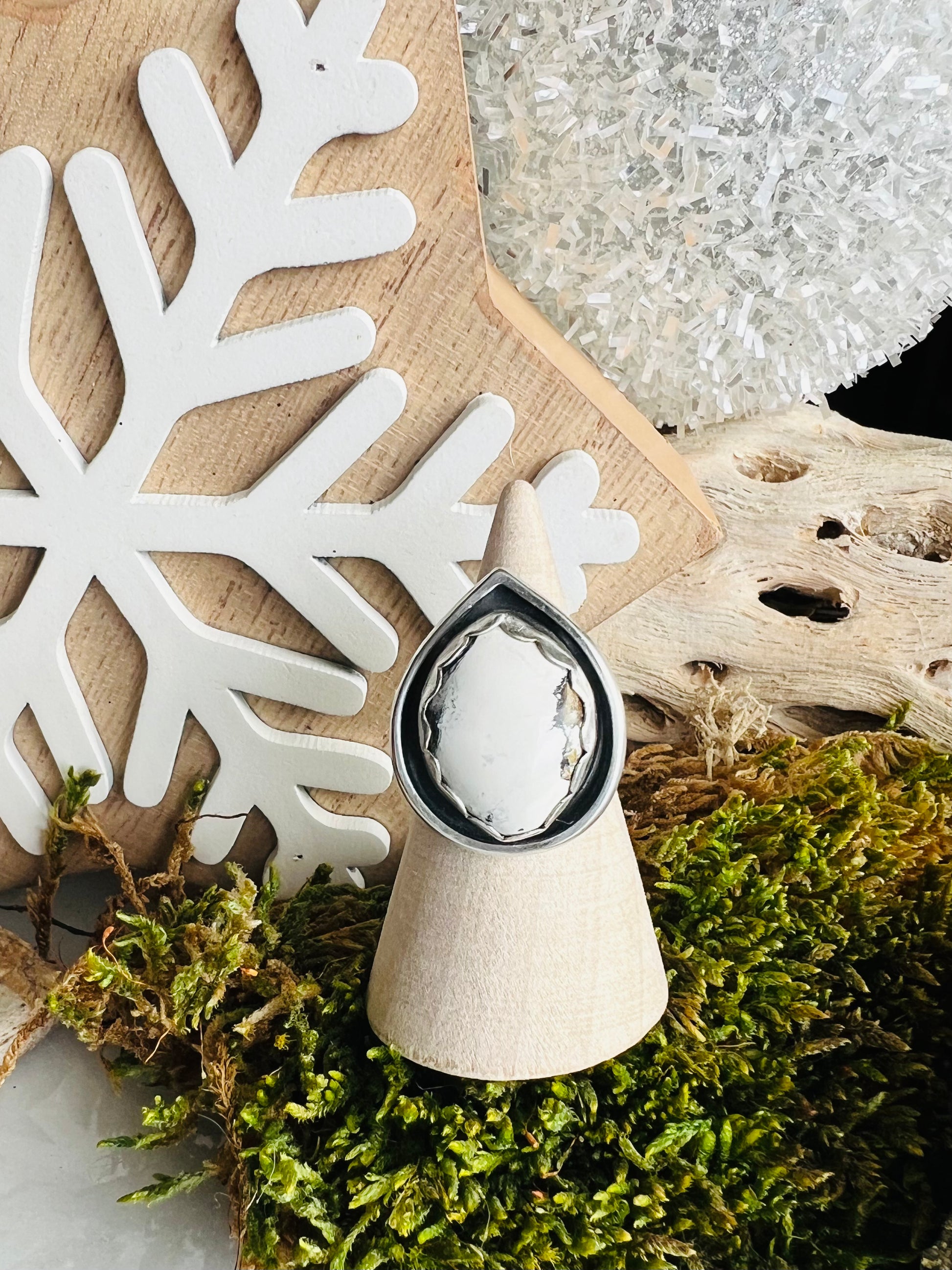 Adjustable sterling silver shadow box ring, featuring pure Variscite discovered in the expansive steppe region of Kazakhstan. This Variscite is a true rarity, showcasing soft antique white hues intertwined with intricate patterns and grey/rusty brown matrix.
