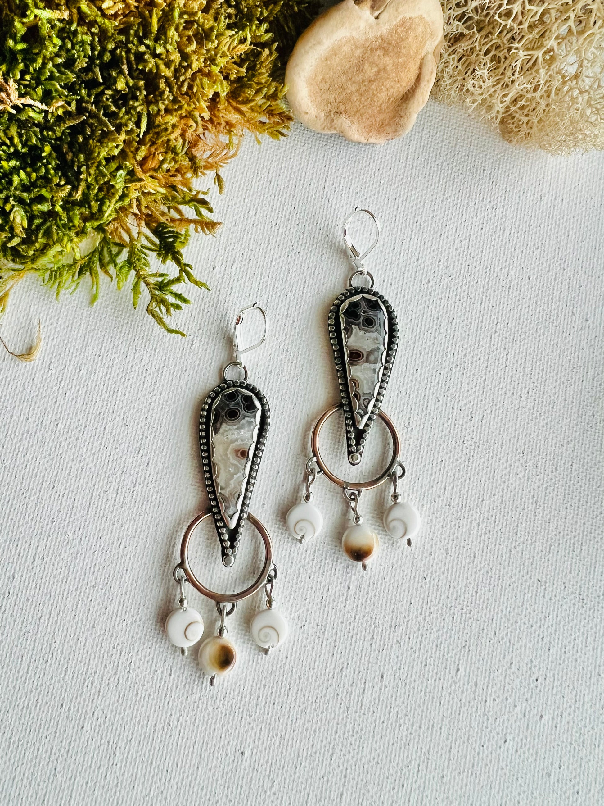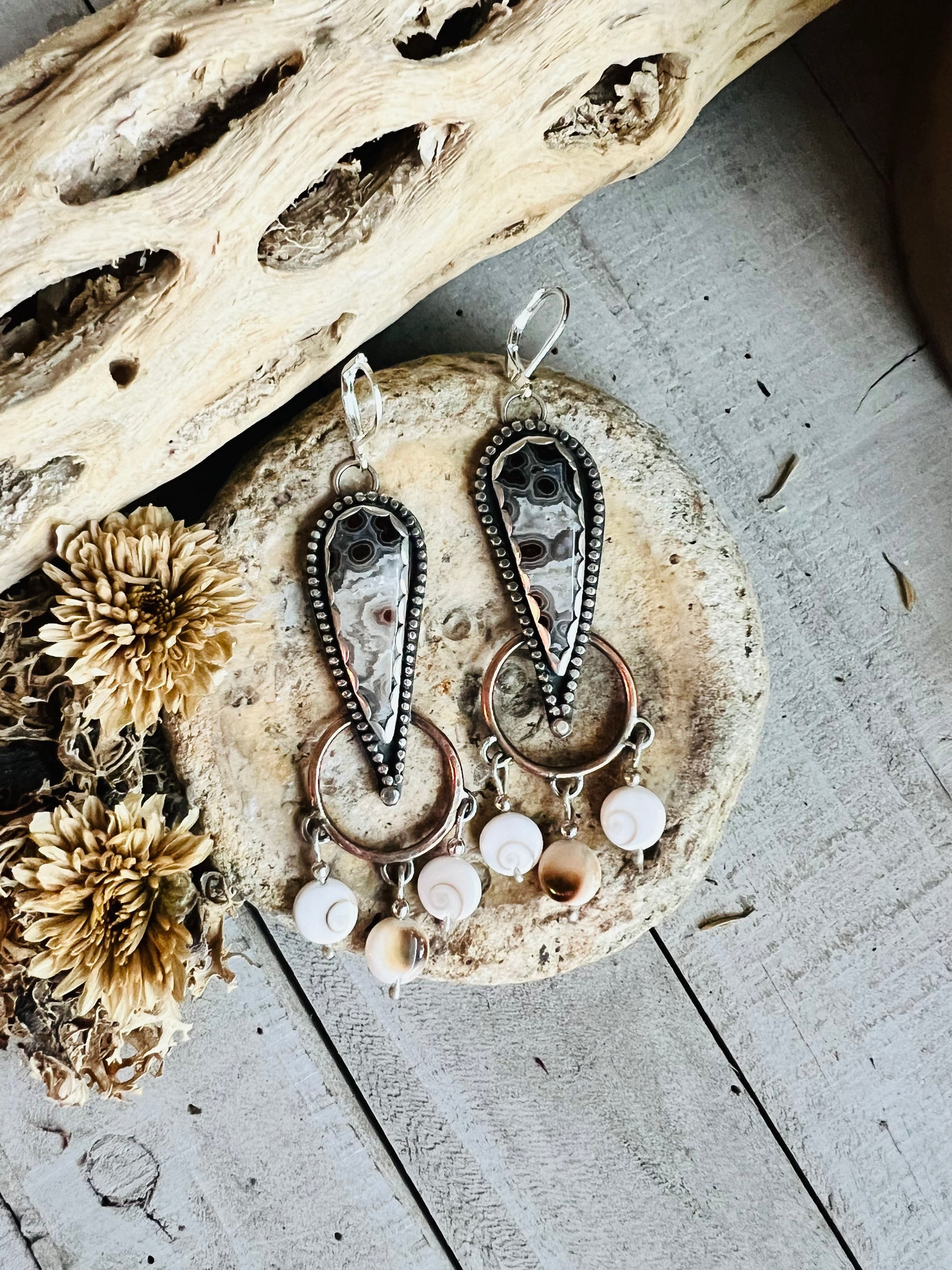 Beautiful swirls and floating orbs dance within this rare pair of recently discovered Indonesian Orb Plume Agates—each stone a tiny world of misty movement and natural magic. Adorned with a bold handcrafted dream catcher design in sterling silver and copper, these earrings are finished with delicate Shiva shell dangles that sway with effortless bohemian grace.