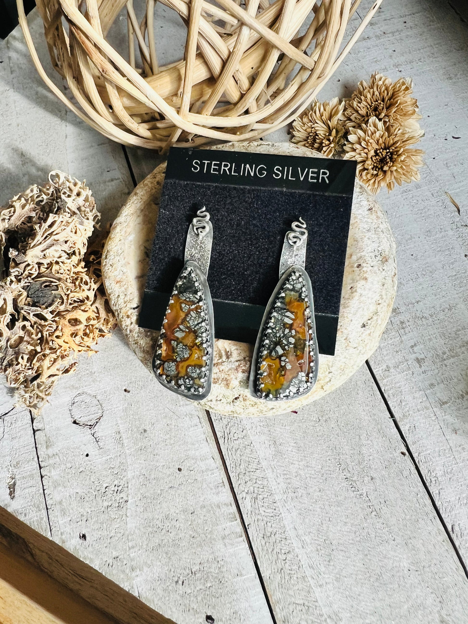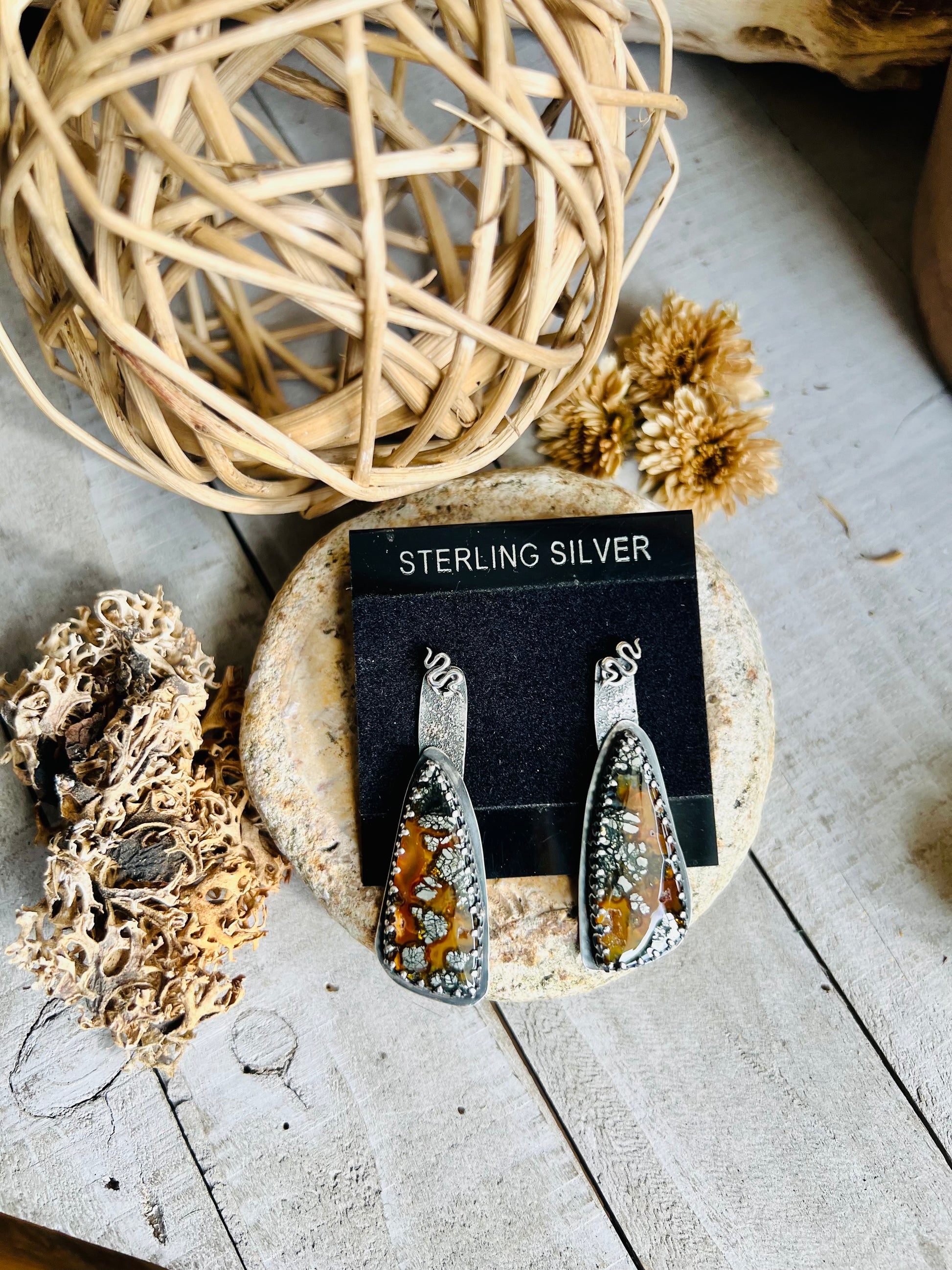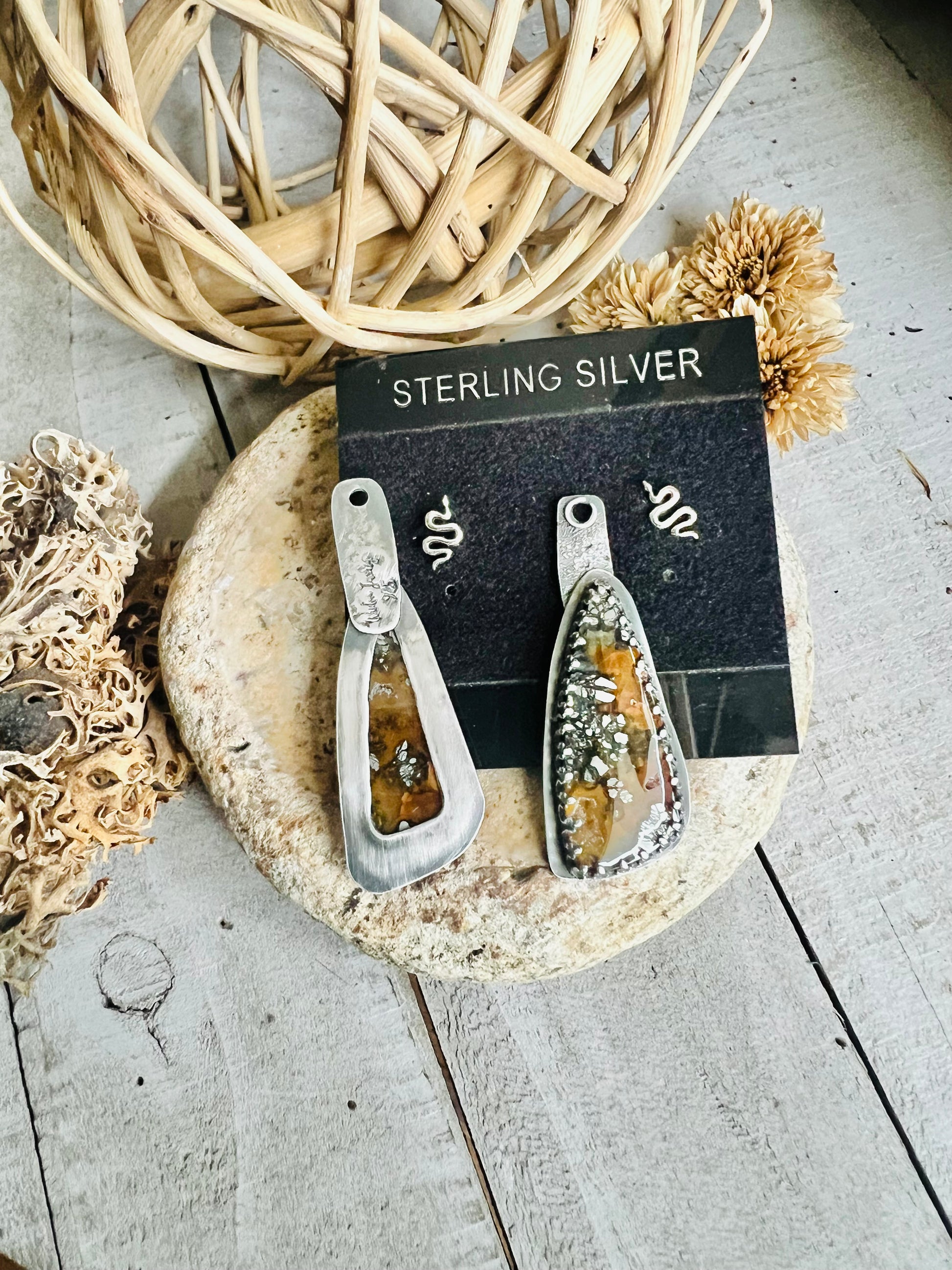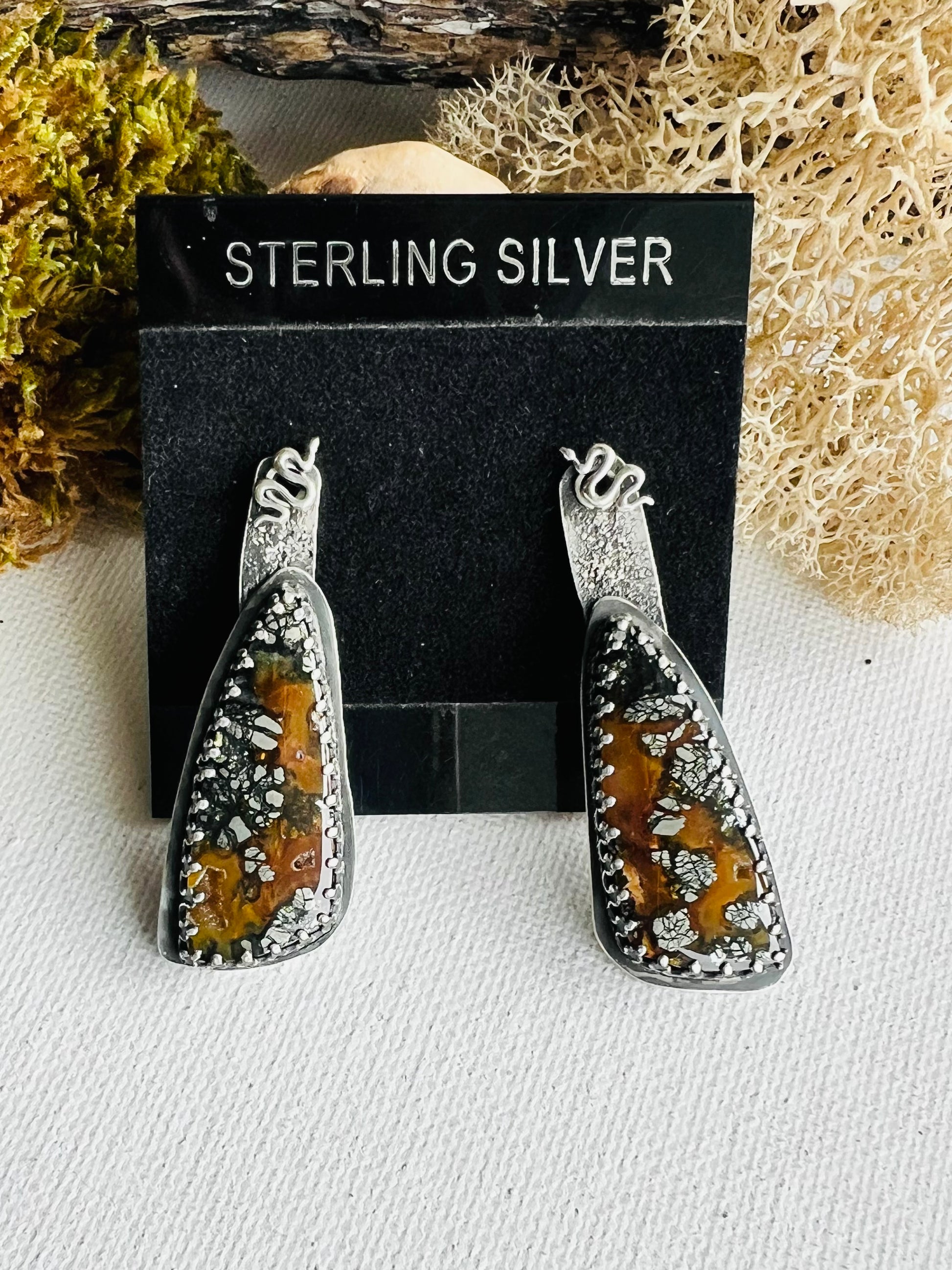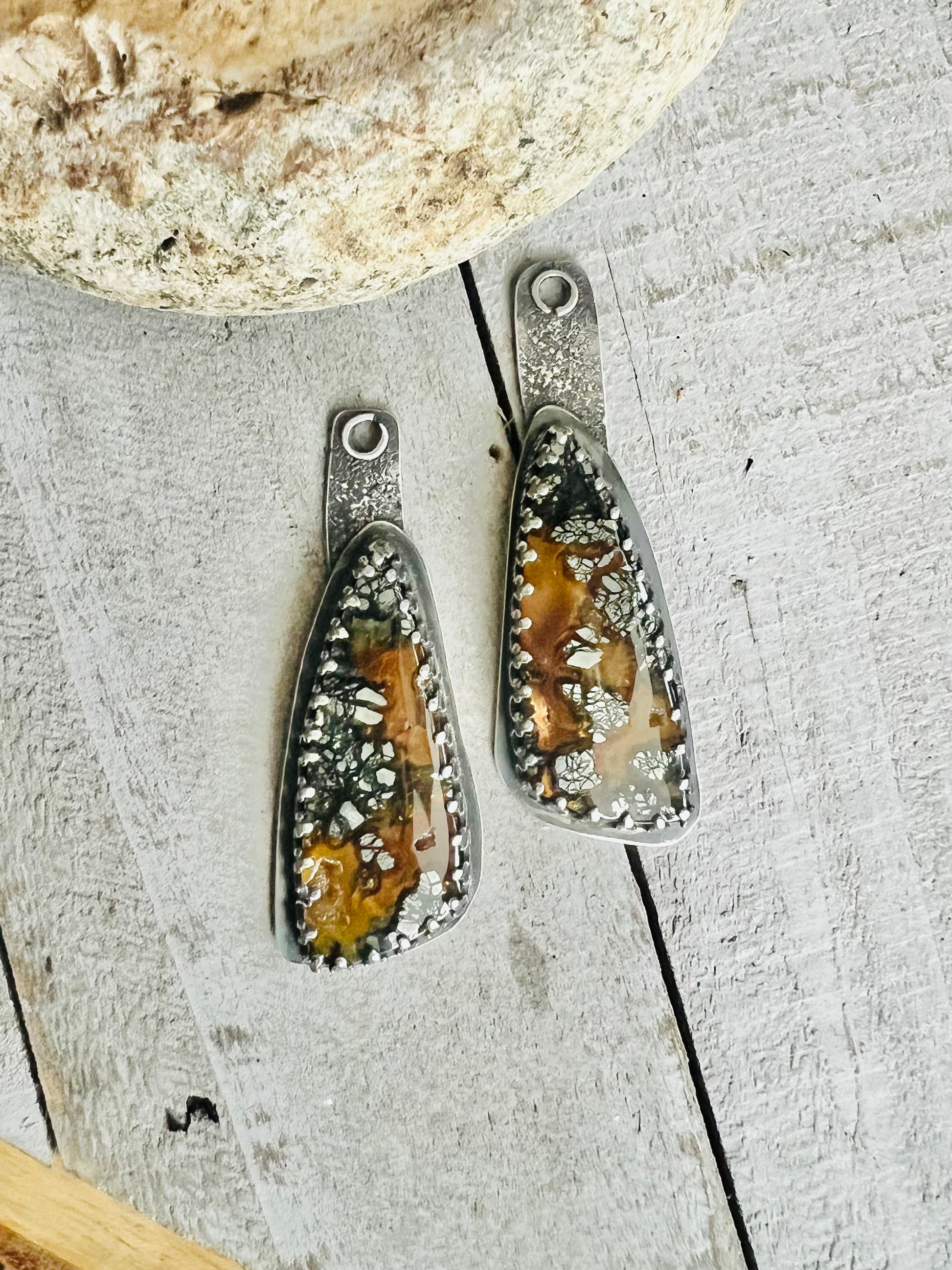 A fierce yet elegant fusion of earth and mystique. These earrings feature rare Marcasite in Agate stones, each showcasing mesmerizing silvery glints and tiny druzy pockets formed over millennia. The open-back settings invite light to dance through the layered erosion patterns—raw, ancient, and naturally sculpted by Mother Nature herself. Suspended from dainty handcrafted snake studs, the ear jackets offer a transformative two-in-one design: wear the studs alone for a subtle edge, or attach the jackets for a statement of fiery enchantment. An ode to the serpent’s symbolism of rebirth and transformation.