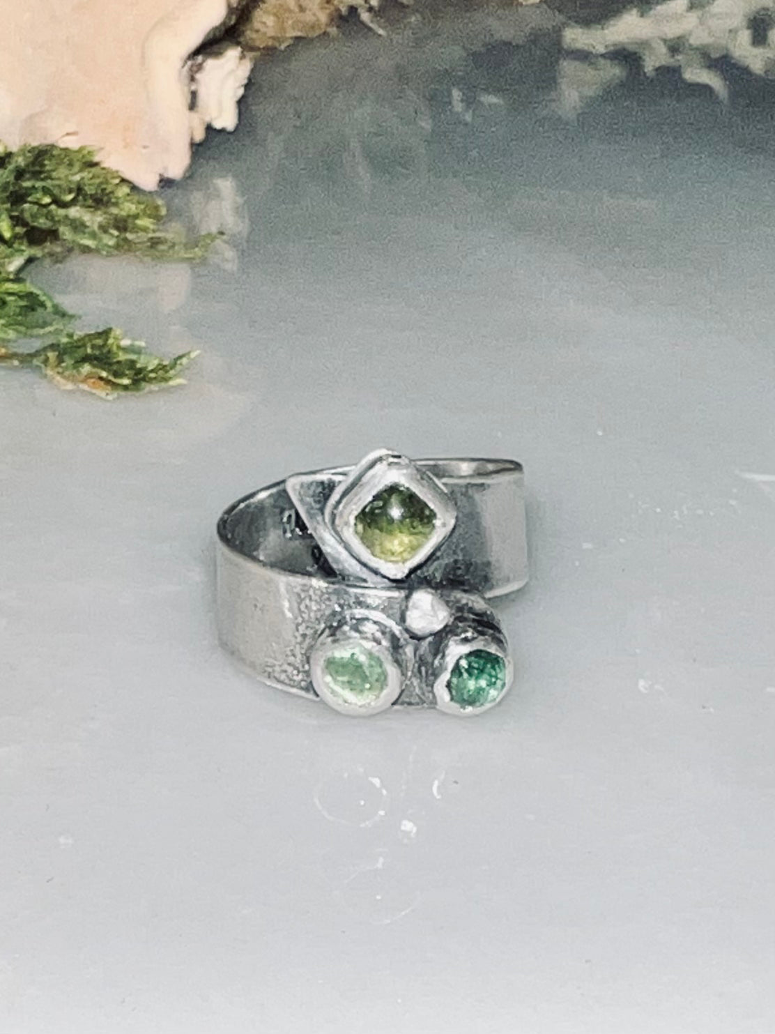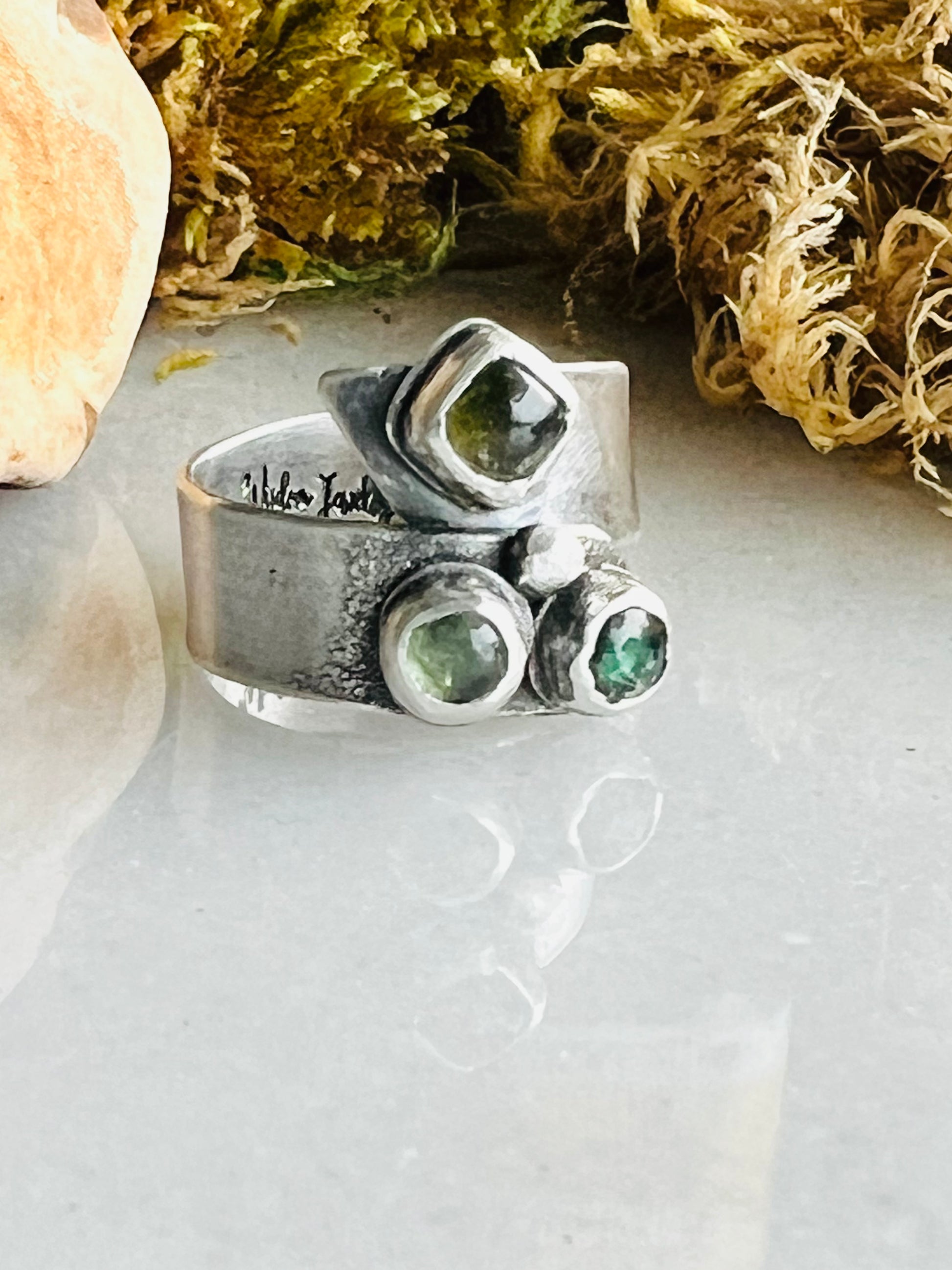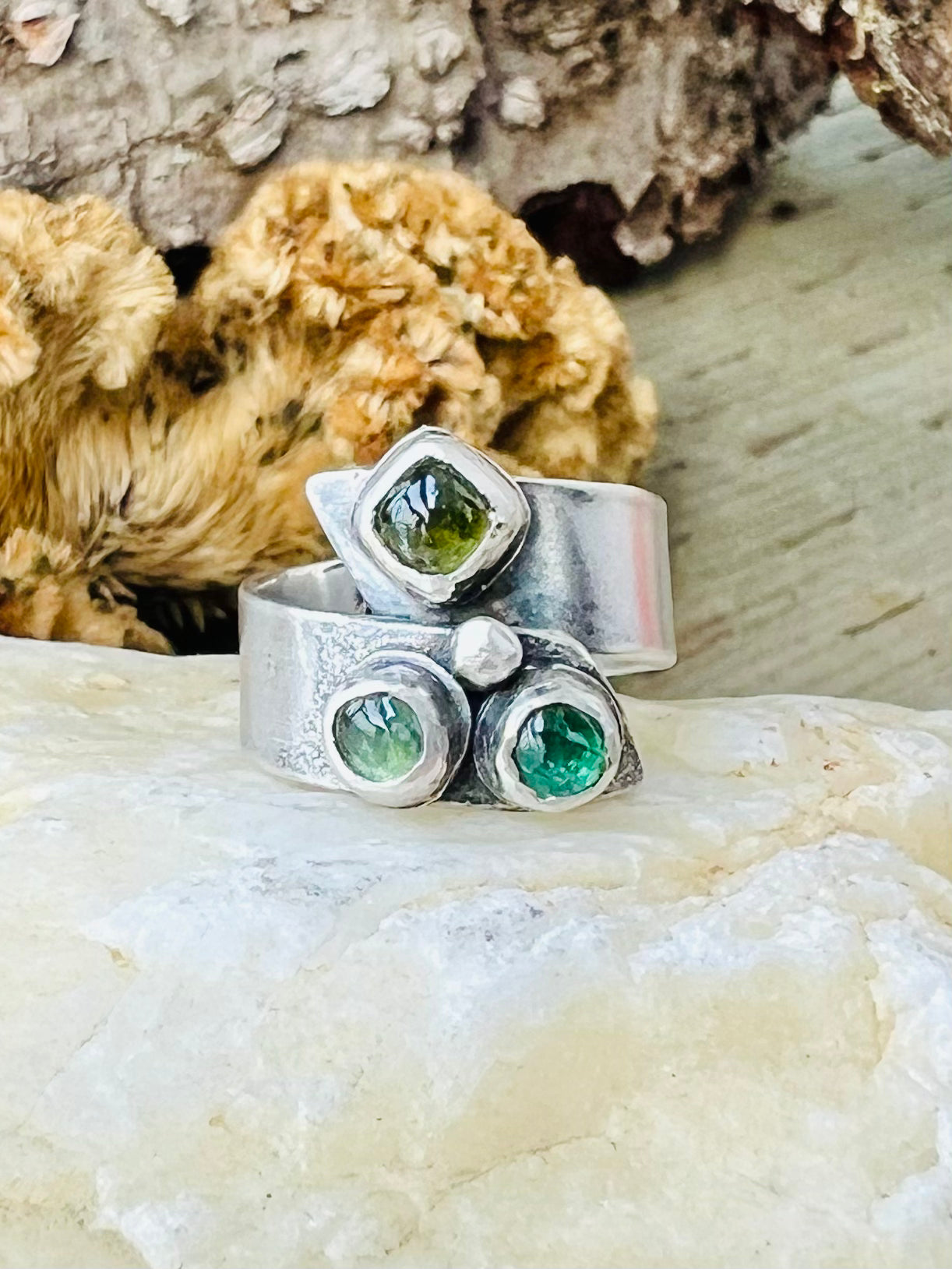 A timeless symbol of love and renewal, this set in your size dainty ring showcases a stunning ombré of green tourmalines, each stone flowing gracefully from light to deep verdant hues. Representing the heart chakra, green tourmaline is celebrated for its ability to inspire physical well-being, spiritual harmony, and growth. Perfectly set in handcrafted, satin finish sterling silver, this ring embodies the balance of vitality and tranquility, making it a meaningful gift for someone special. Celebrate love, connection, and nature’s beauty with this exquisite ombré design—ideal for Valentine’s Day or any occasion of the heart.