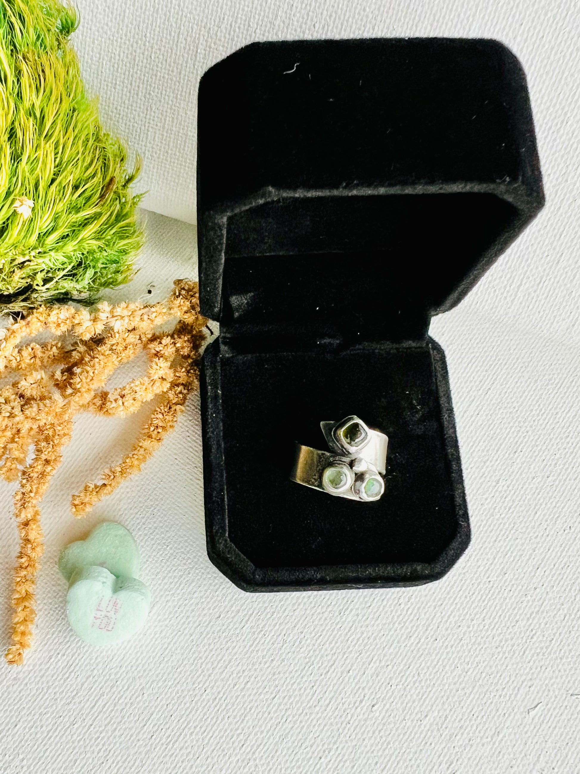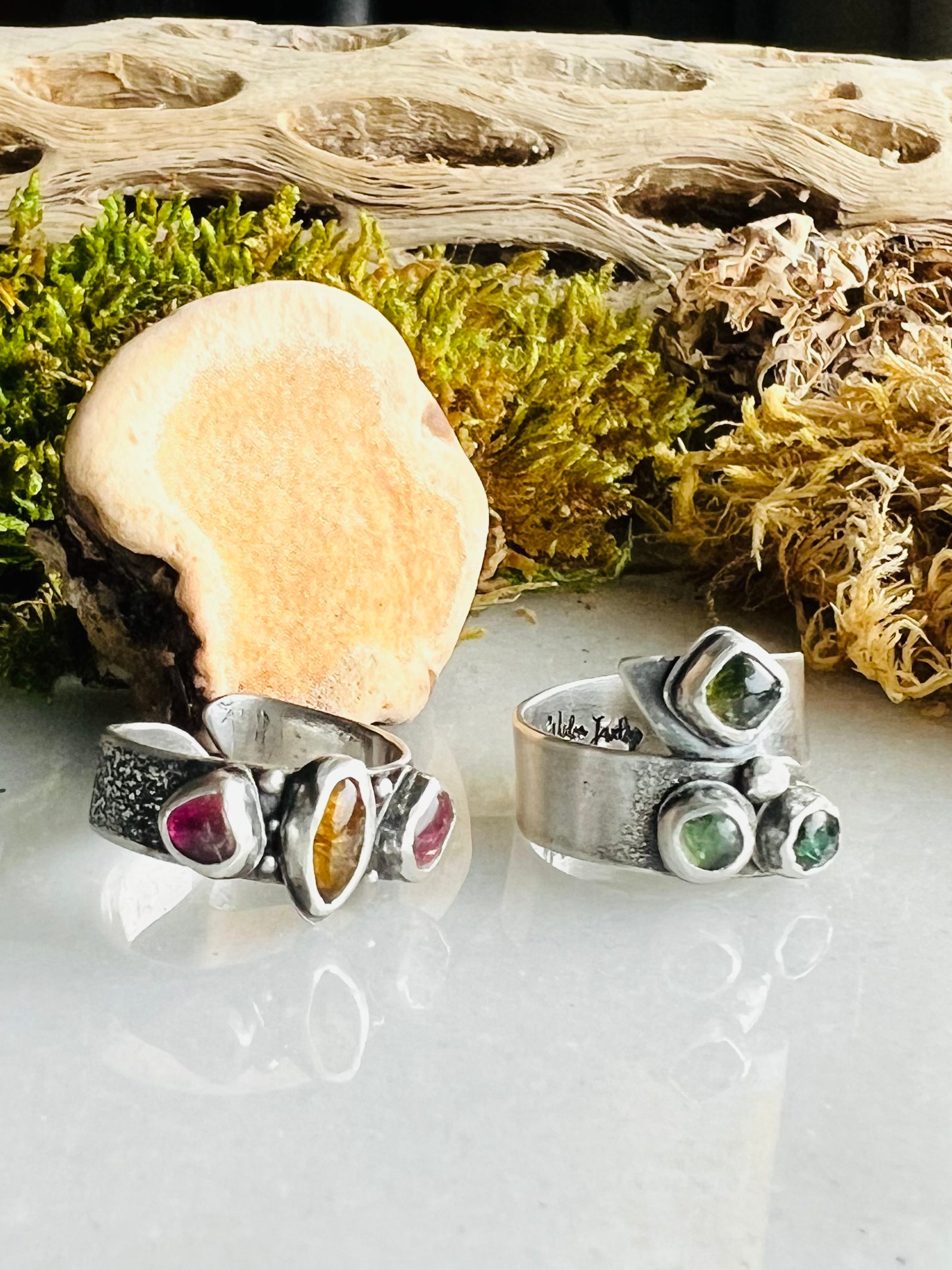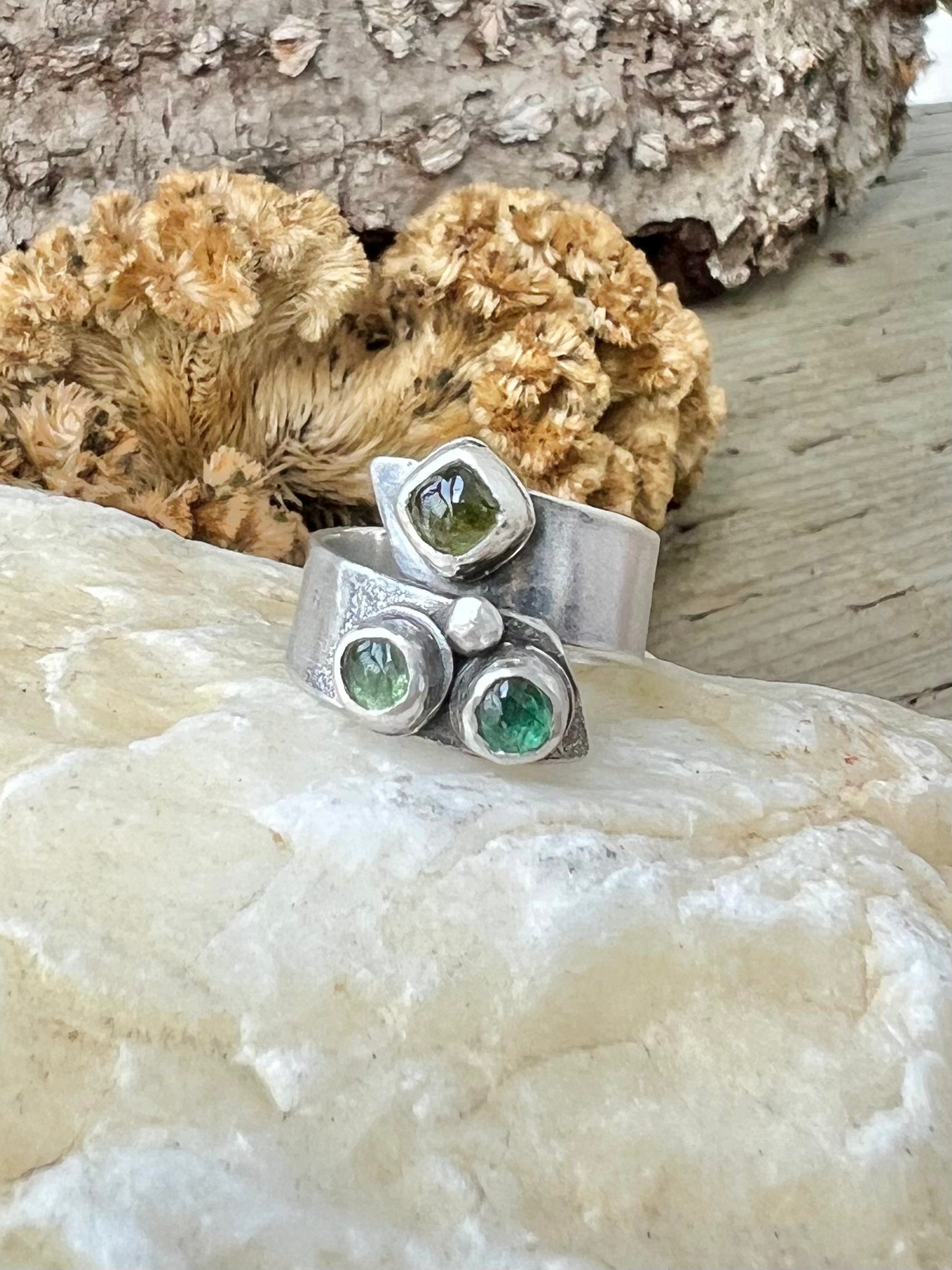 A timeless symbol of love and renewal, this set in your size dainty ring showcases a stunning ombré of green tourmalines, each stone flowing gracefully from light to deep verdant hues. Representing the heart chakra, green tourmaline is celebrated for its ability to inspire physical well-being, spiritual harmony, and growth. Perfectly set in handcrafted, satin finish sterling silver, this ring embodies the balance of vitality and tranquility, making it a meaningful gift for someone special. Celebrate love, connection, and nature’s beauty with this exquisite ombré design—ideal for Valentine’s Day or any occasion of the heart.