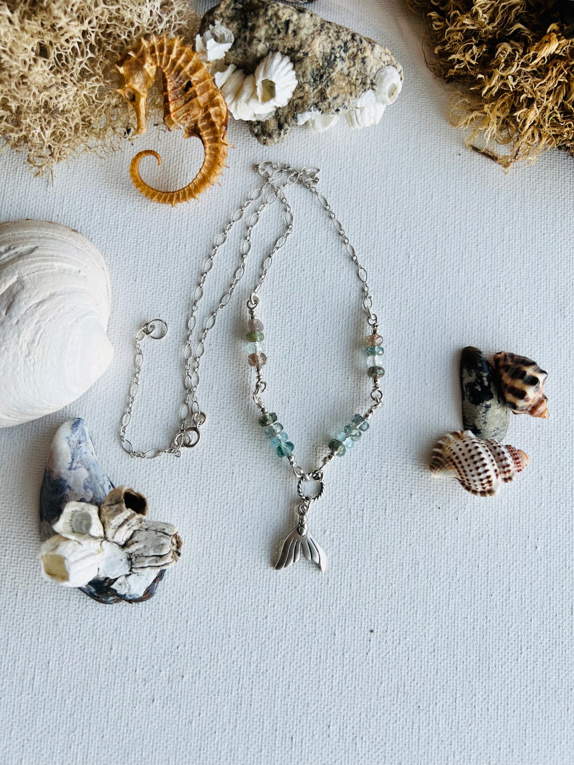 A soft satin-finish sterling silver mermaid tail charm hangs effortlessly from a dainty sterling silver chain, adorned with high-quality Moss Aquamarine rondelles that shimmer like sunlight dancing on the waves. The organic texture of the sand casting process gives it the appearance of a lost relic, as if it fell from the mermaid who once wore it, now resting on the ocean floor, waiting to be found.