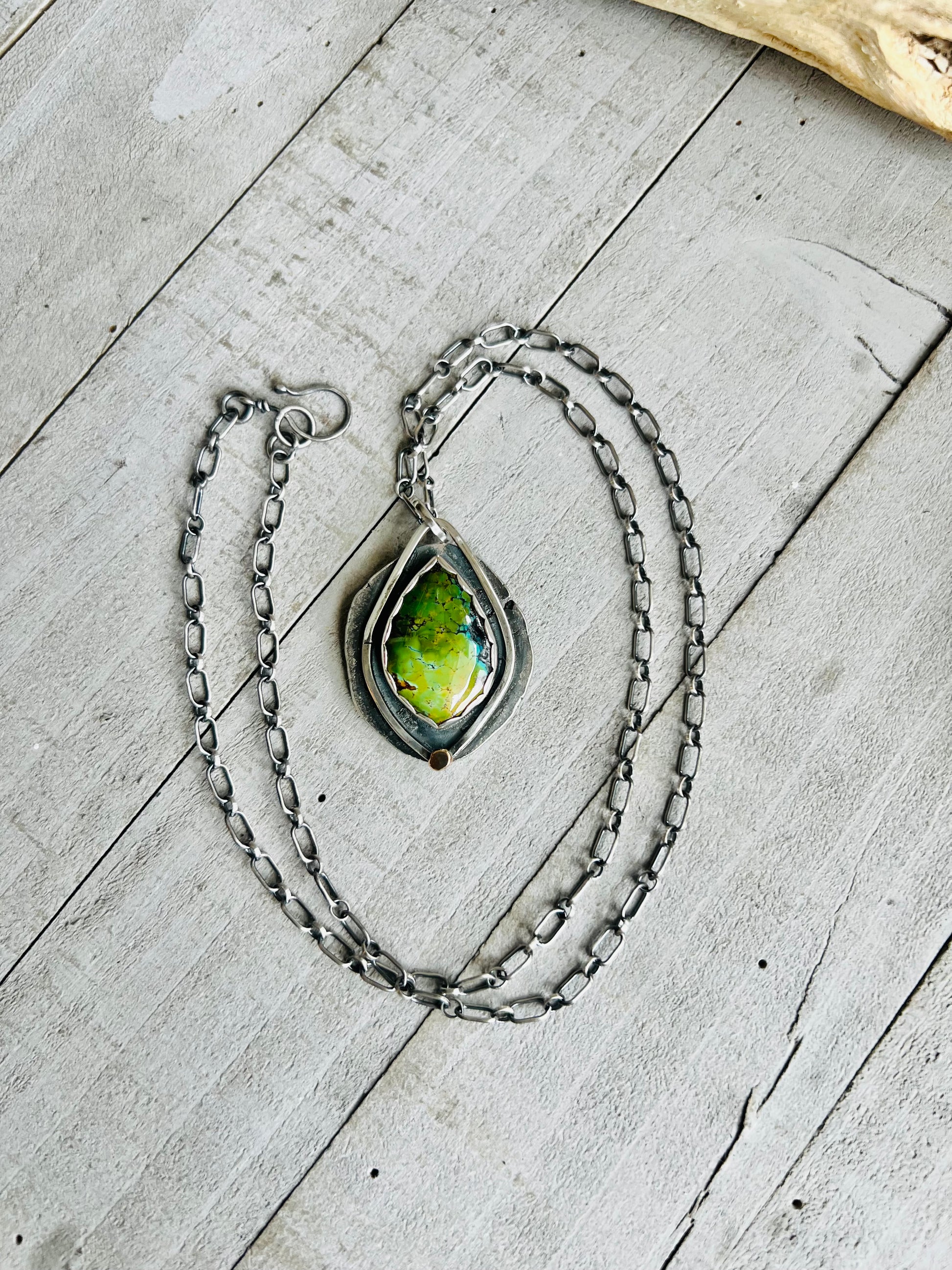 Rugged, raw, and full of character—this bold pendant carries the same untamed spirit as its ring counterpart. At the center lies a polychrome Qingu Hubei turquoise, rich with earthy patterns that echo ancient landscapes. The pendant is handcrafted from recycled sterling silver, and 14k gold filled accent., and finished with subtle sterling silver stamp work. On the back, a skull stamp adds a hidden edge—a quiet reminder of strength, resilience, and the beauty of life’s cycle.