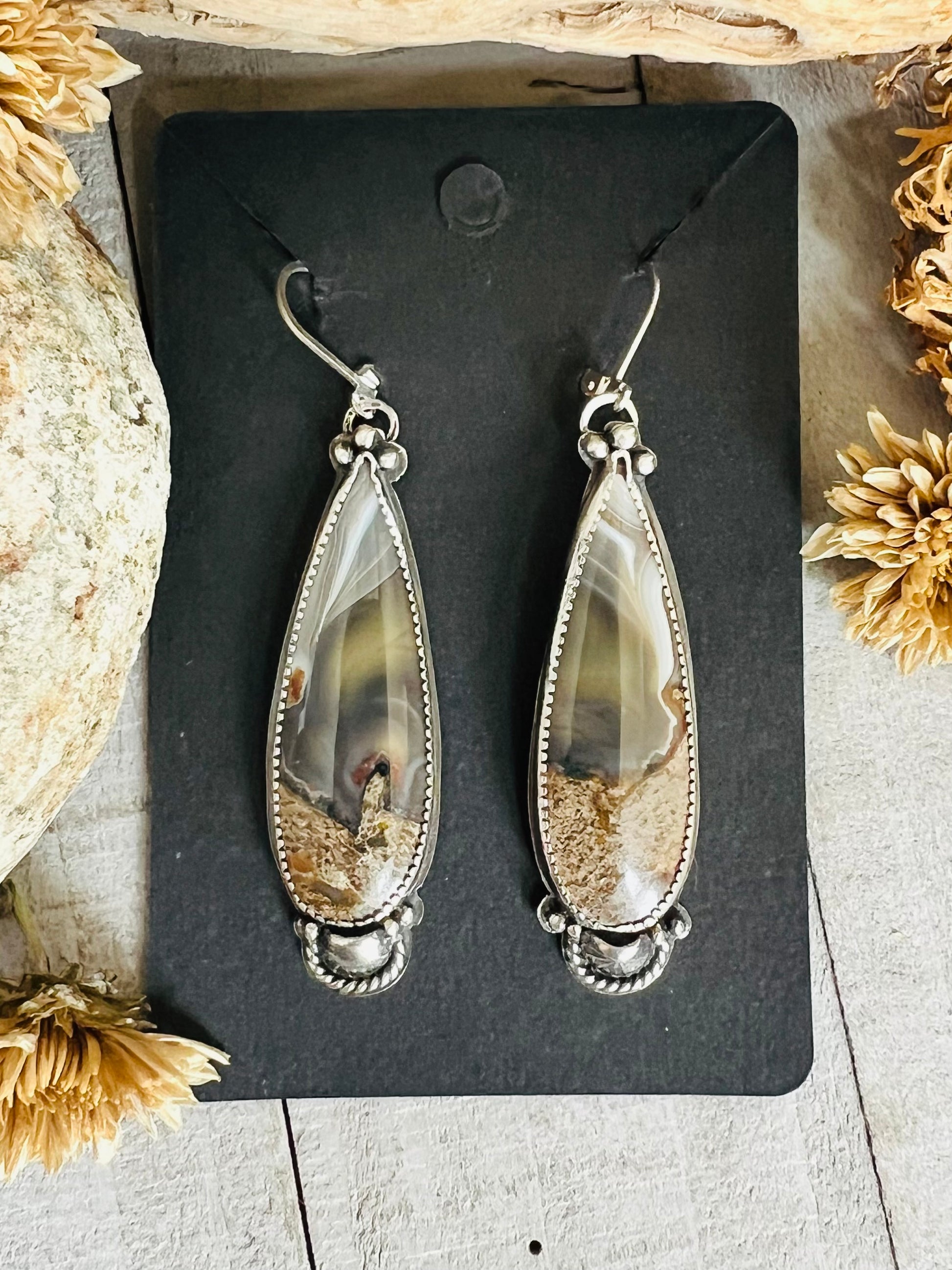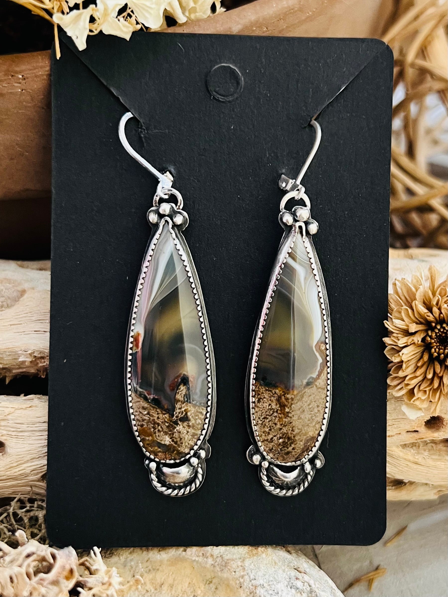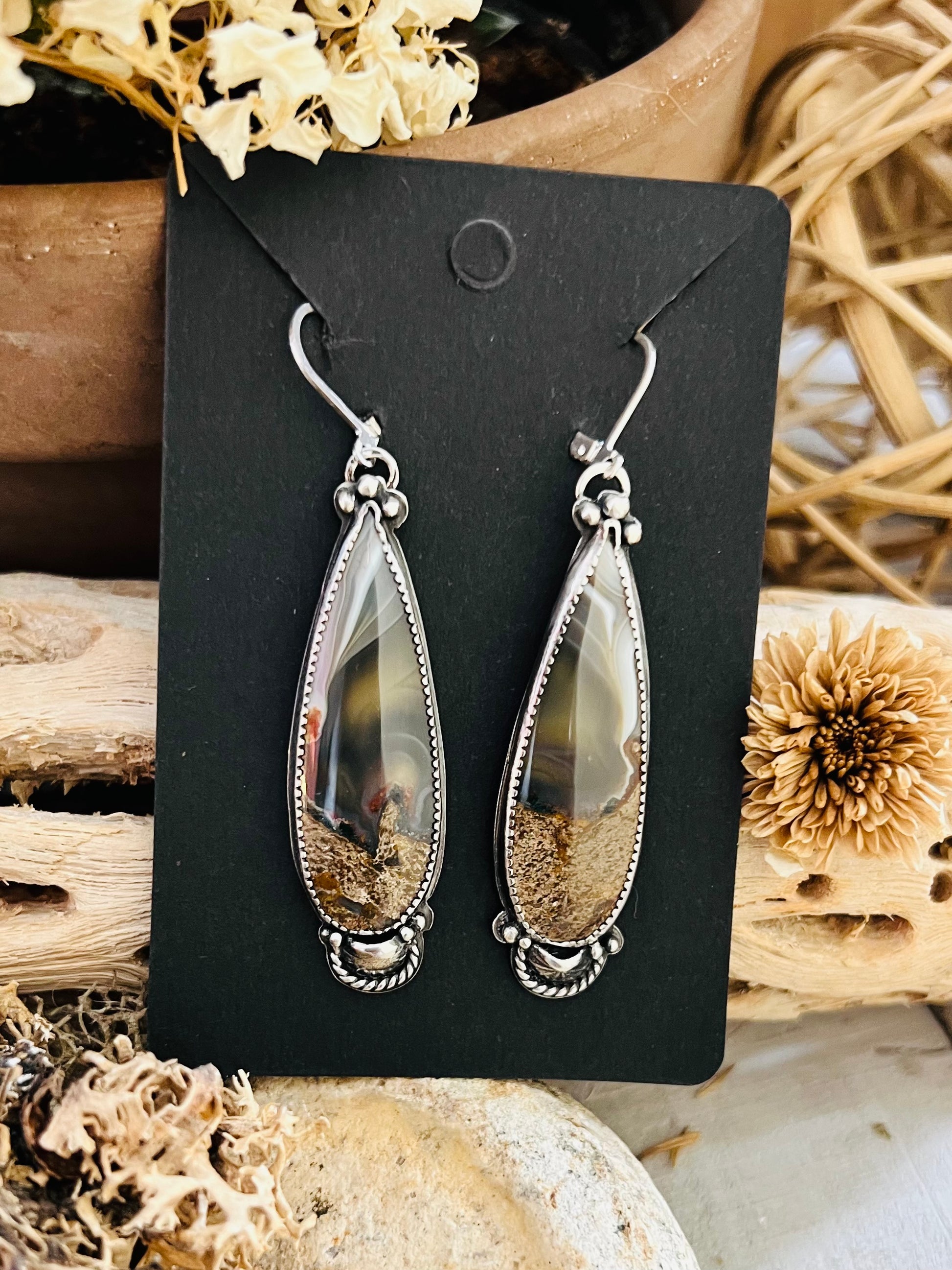 Beautiful scenic Timor Agates evoke the mystique of a desert night, each stone capturing a dreamlike landscape in earthy, moody tones. Set in all sterling silver with open backs to let light travel through, these earrings highlight the natural beauty and depth of the stones.