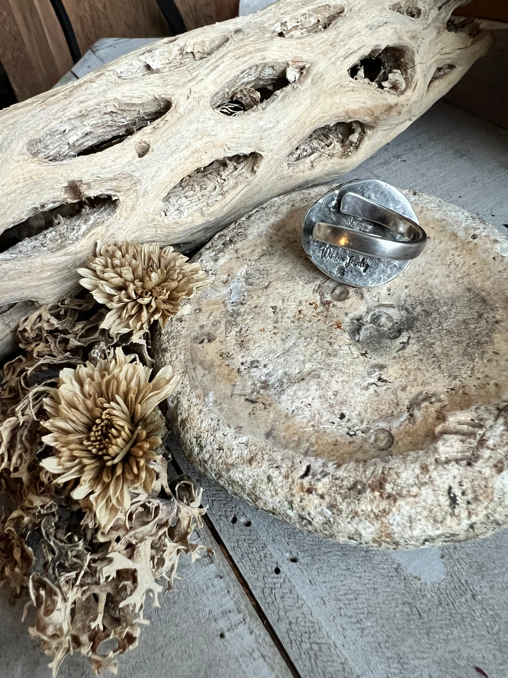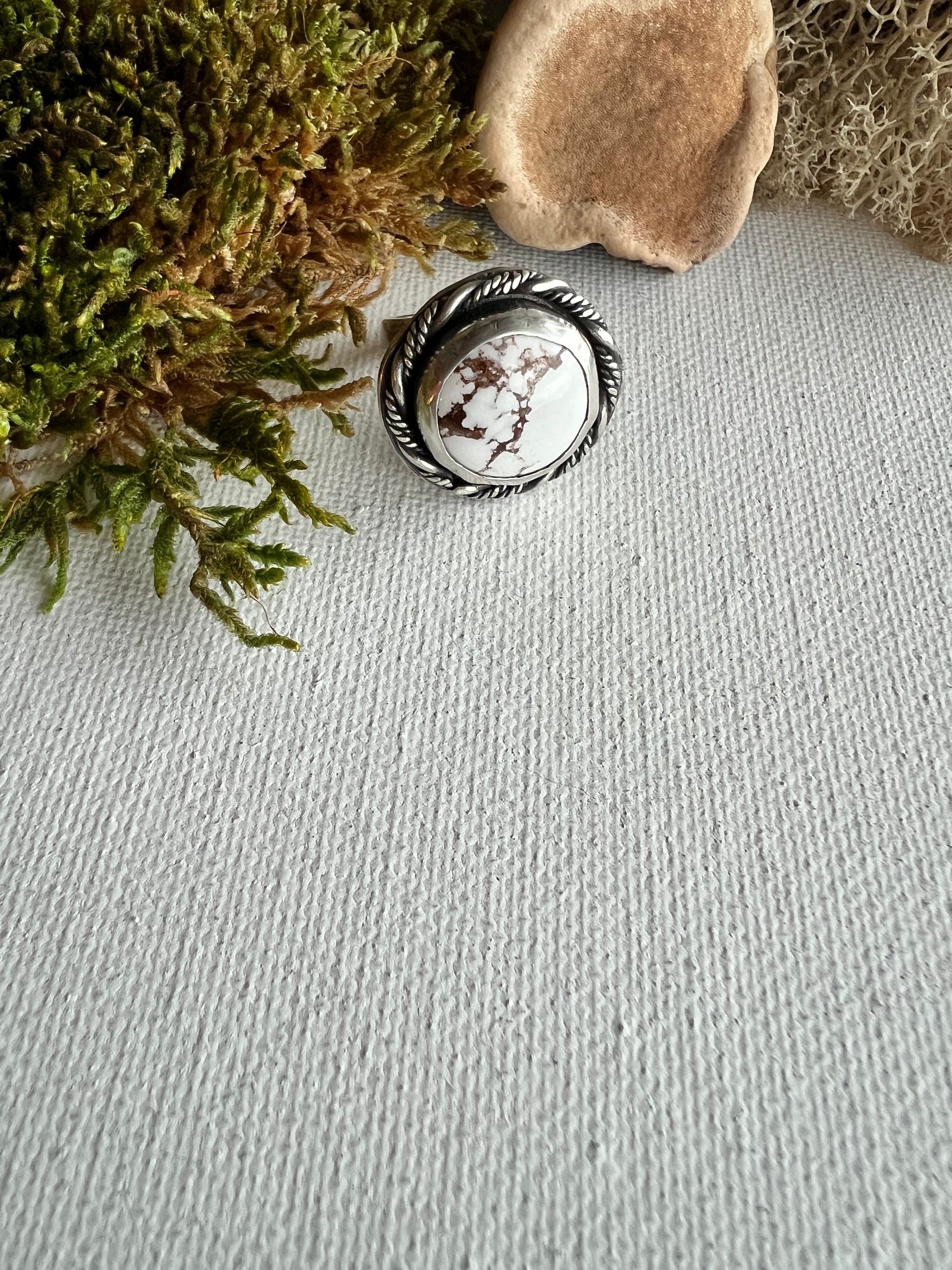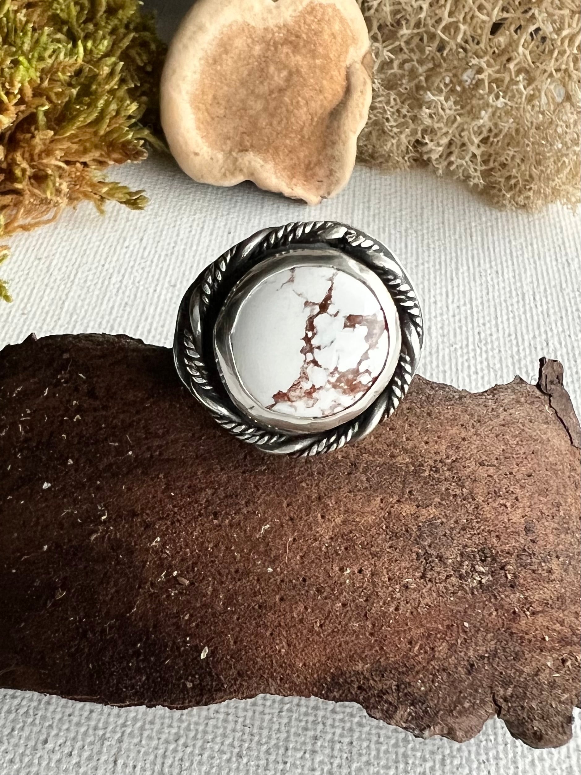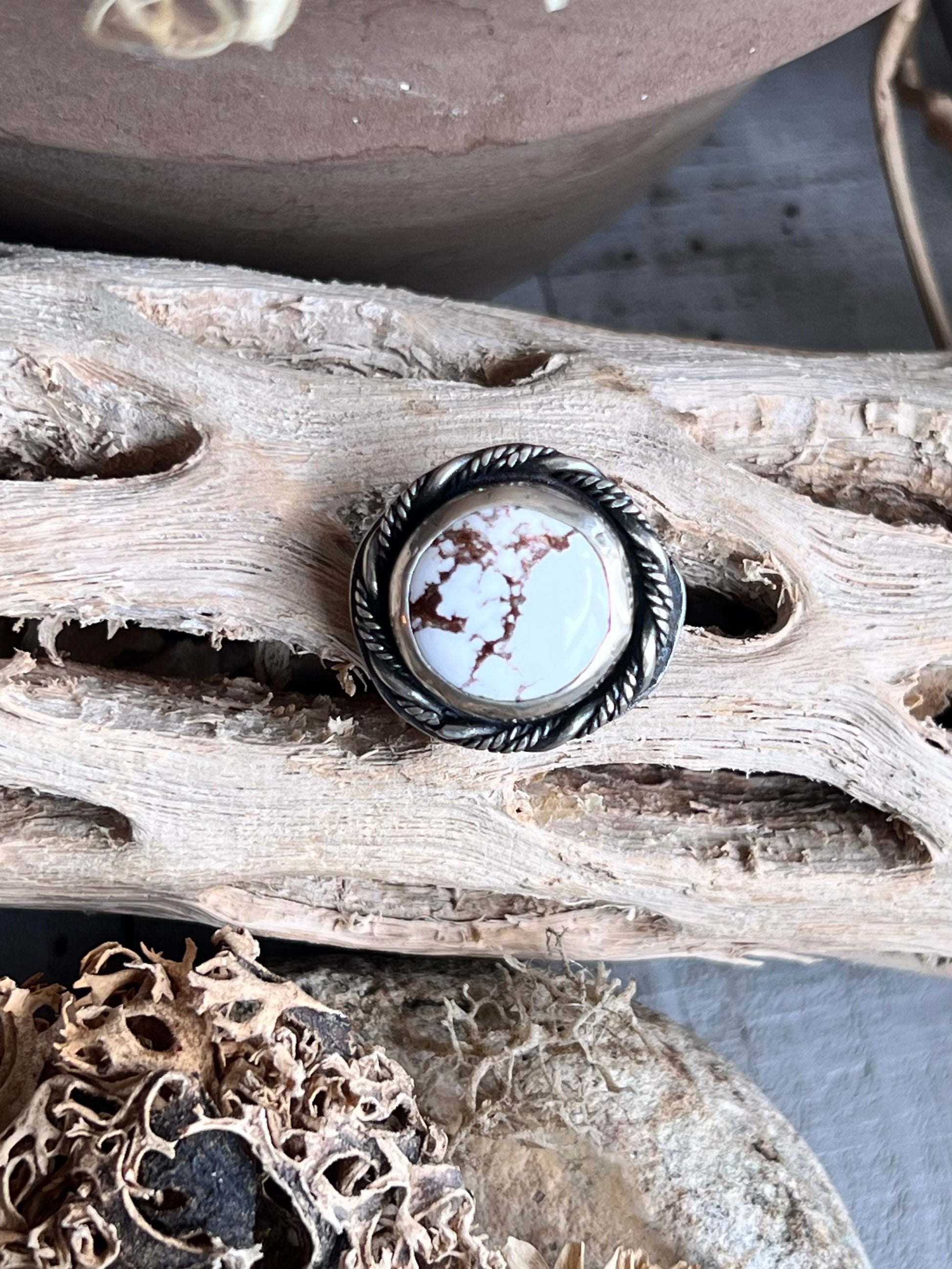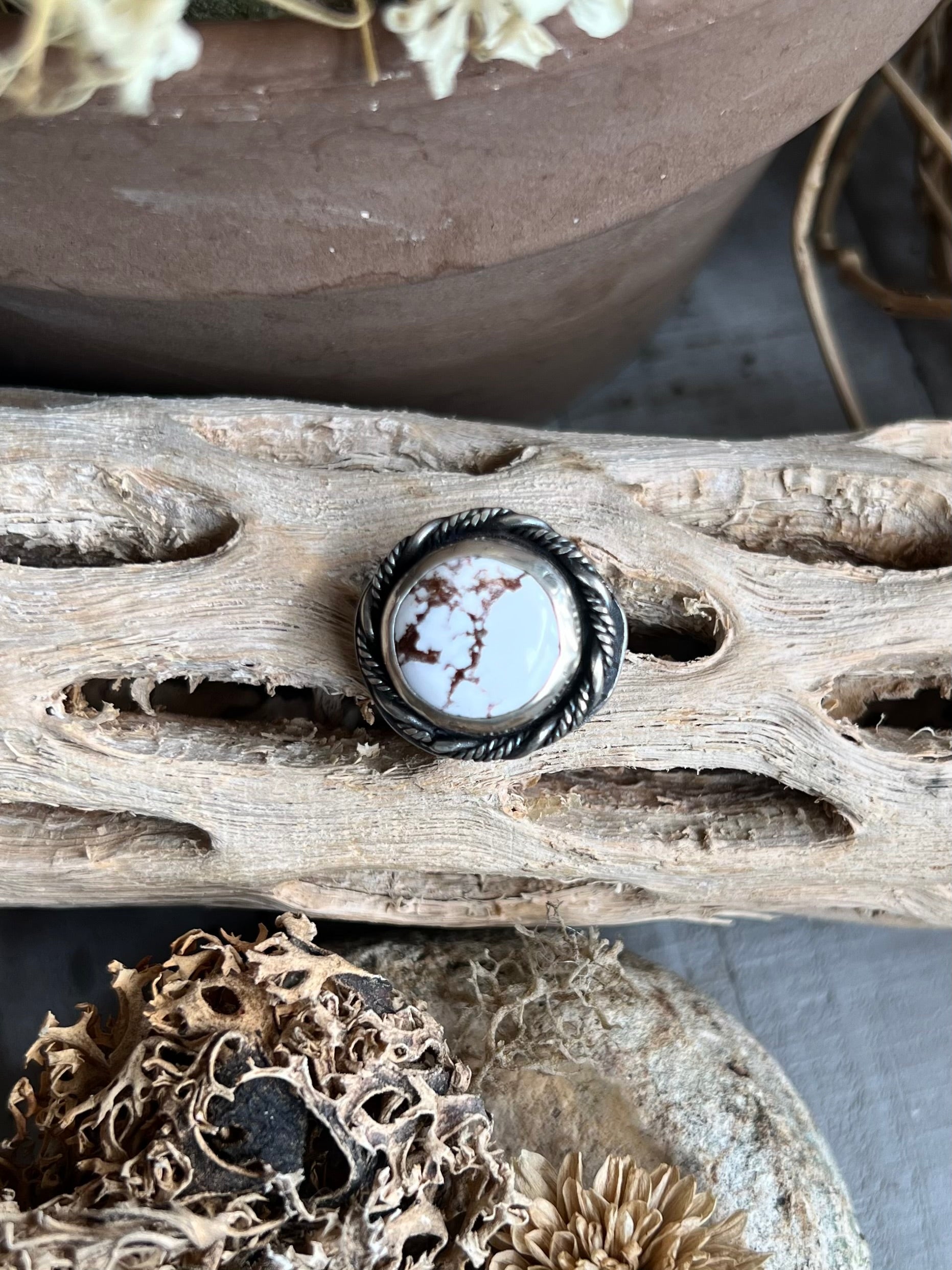 A bold slice of Wild Horse—marbled in shades of white and brown—takes center stage in this striking all-sterling silver ring. The natural patterns echo sun-bleached trails and dusty desert skies, grounding the piece in raw Western beauty. Hand-forged and fully adjustable, it’s designed for comfort, durability, and everyday adventure.