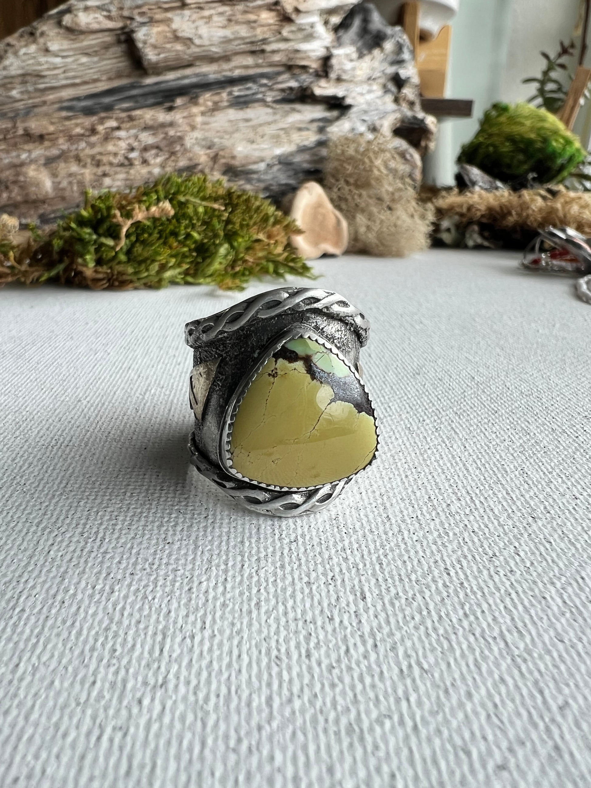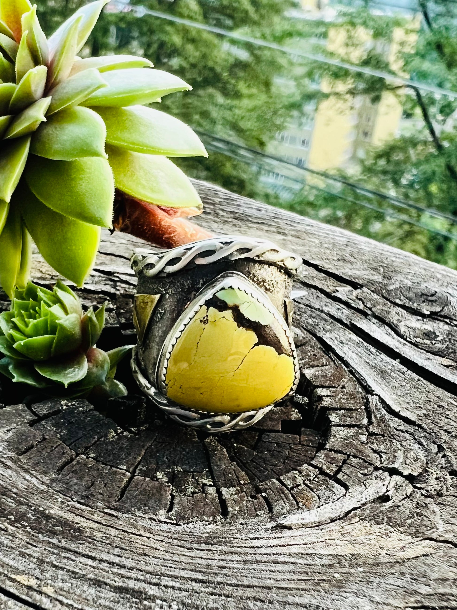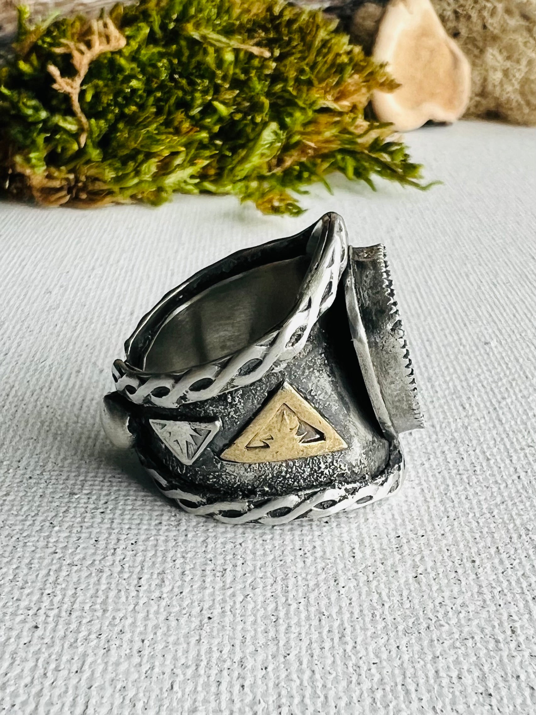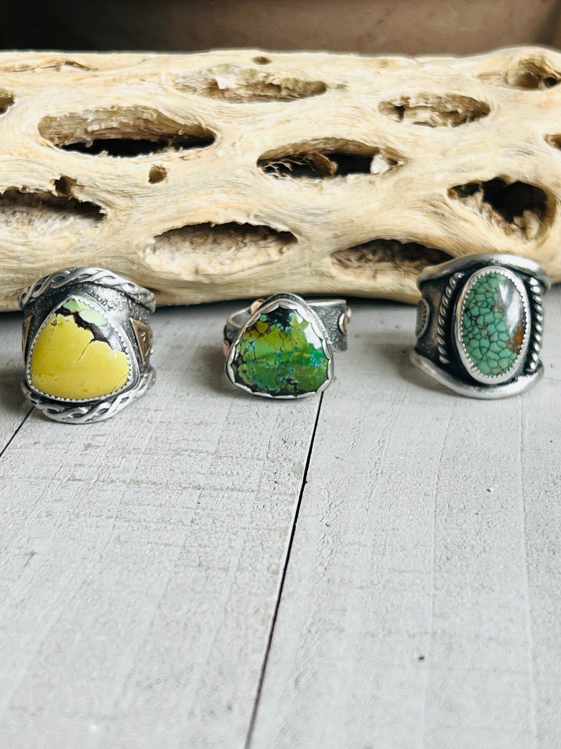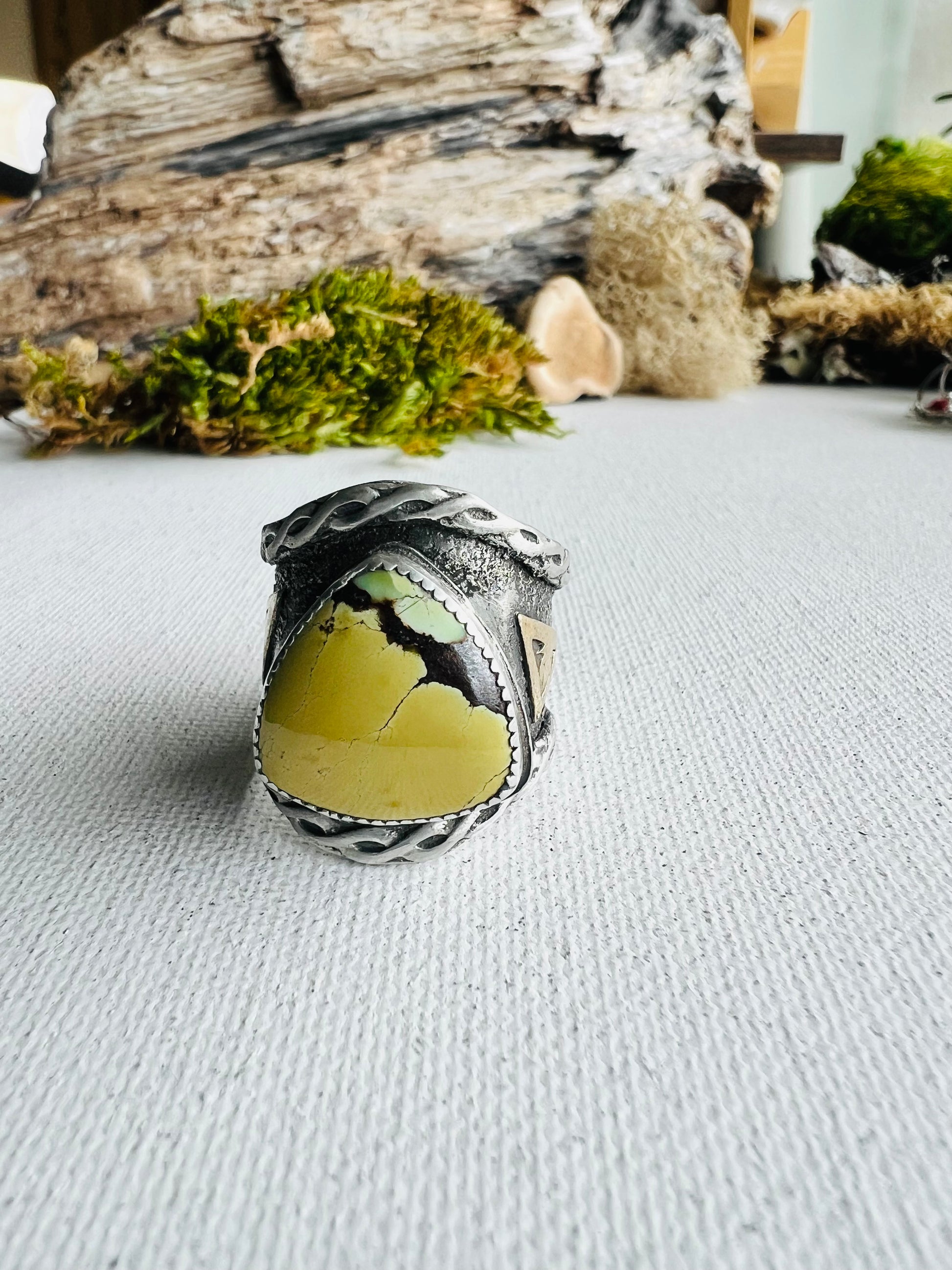 A bold roughed signet ring, built for those who like their jewelry with grit and character. At the center rests a striking polychrome Qingu Hubei turquoise, alive with swirling earthy tones that echo the rugged landscapes it came from. The band is handcrafted from recycled sterling silver, detailed with sterling silver and bronze stamps that add a touch of heritage and individuality. Its adjustable design ensures versatility, with a starting size of 10—made to grow with you, adapt to you, and last a lifetime.