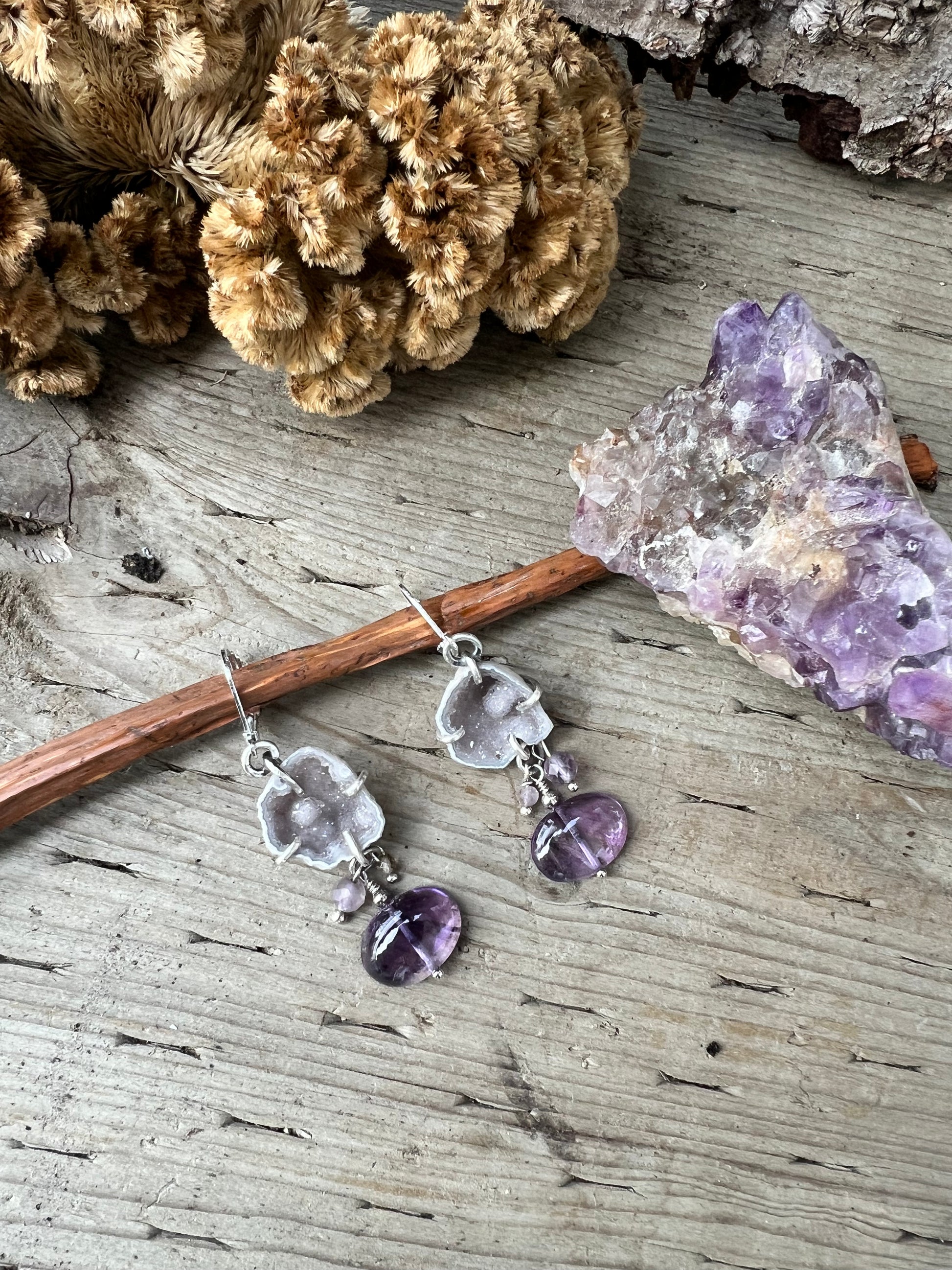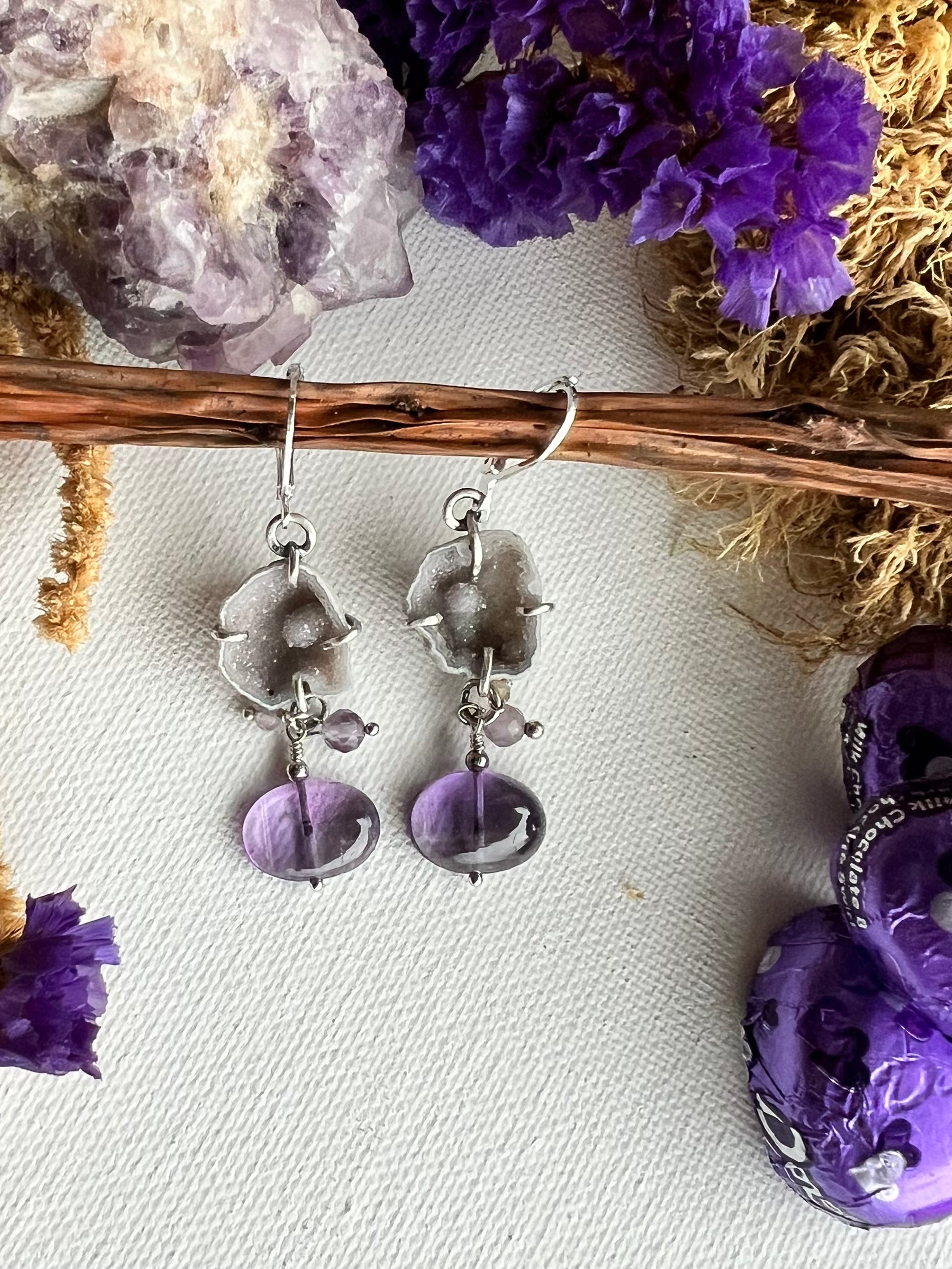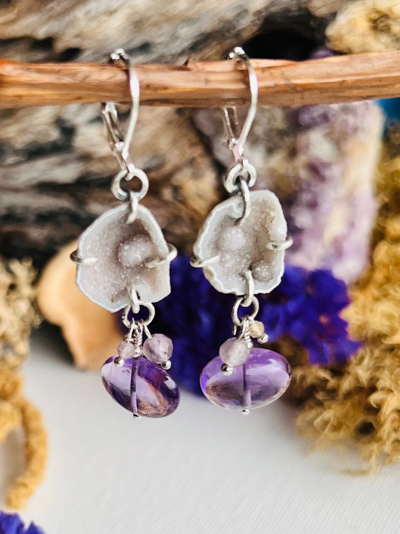 Step into a world of natural wonder with the Violet Geo Caves Earrings. This striking pair features tiny violet geodes, their crystalline interiors sparkling like hidden treasures. Adorned with juicy, gemmy amethysts, these earrings exude a radiant glow, blending raw natural beauty with refined elegance. Handcrafted in satin-finished sterling silver, they are perfect for those who appreciate bold, one-of-a-kind designs inspired by nature’s secret creations. Mystical and captivating, these earrings are tiny caves of violet magic.