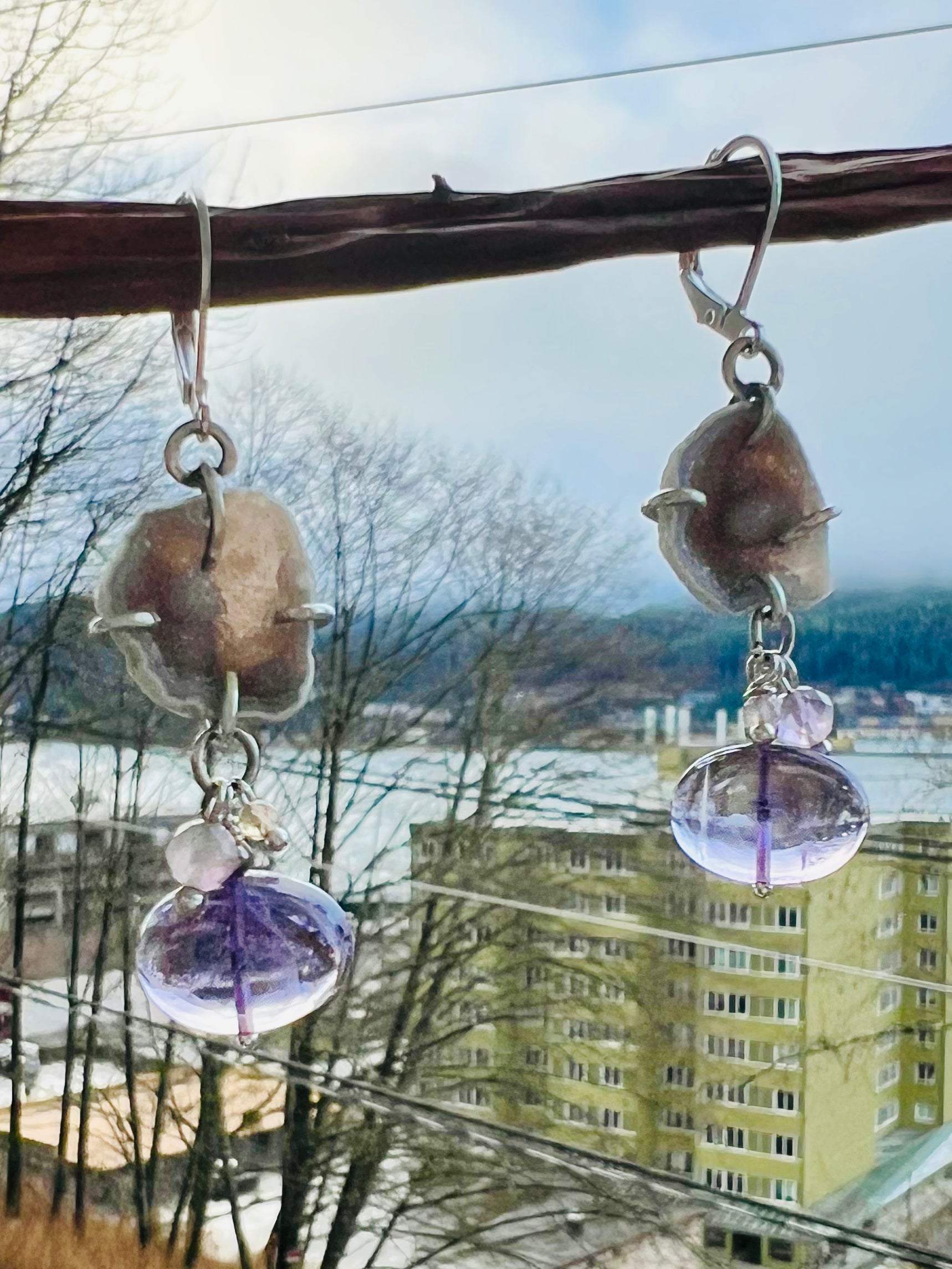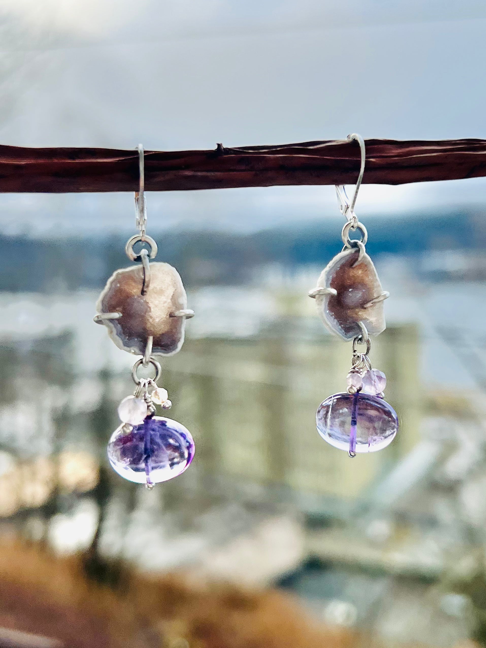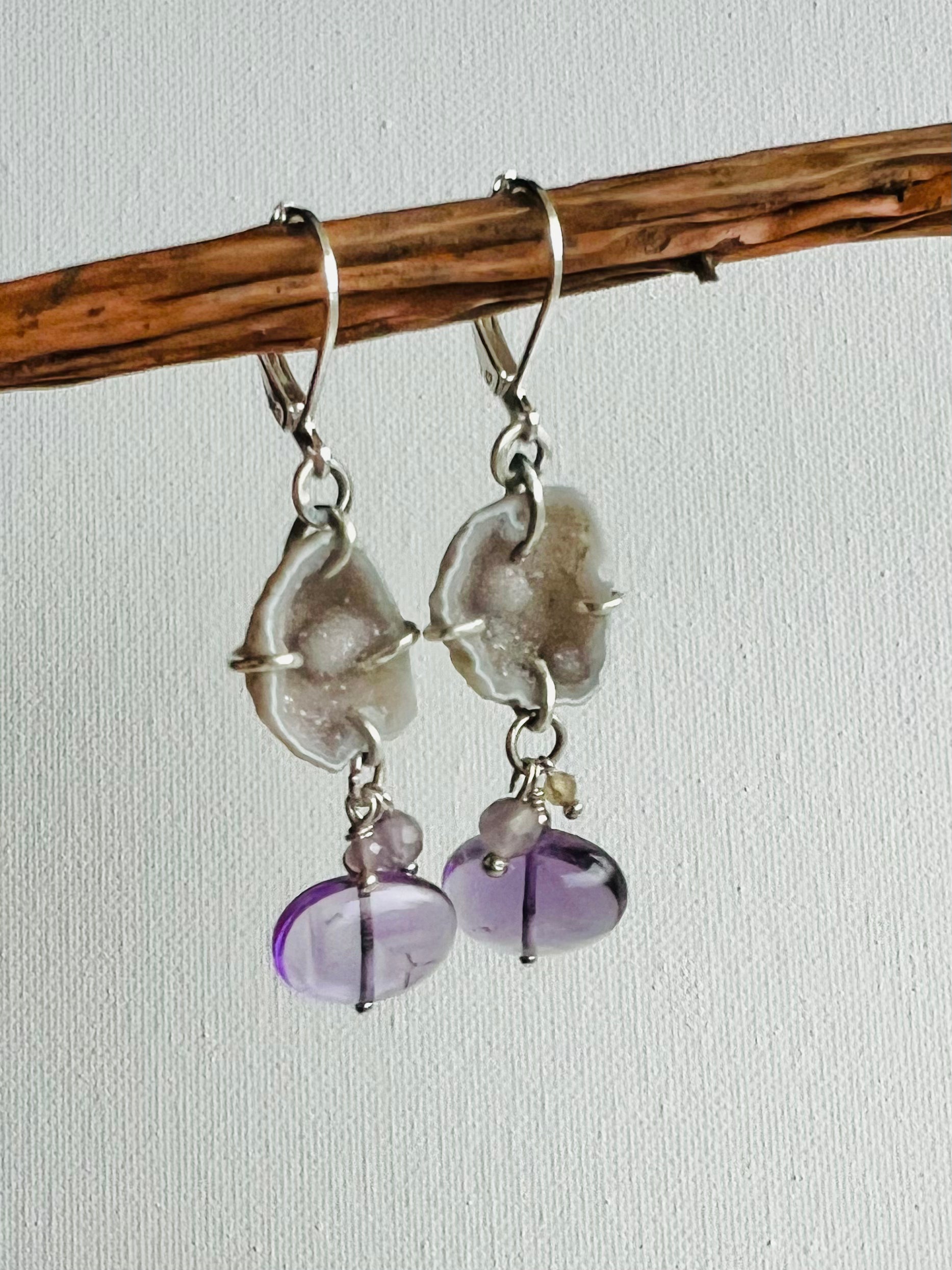 Step into a world of natural wonder with the Violet Geo Caves Earrings. This striking pair features tiny violet geodes, their crystalline interiors sparkling like hidden treasures. Adorned with juicy, gemmy amethysts, these earrings exude a radiant glow, blending raw natural beauty with refined elegance. Handcrafted in satin-finished sterling silver, they are perfect for those who appreciate bold, one-of-a-kind designs inspired by nature’s secret creations. Mystical and captivating, these earrings are tiny caves of violet magic.