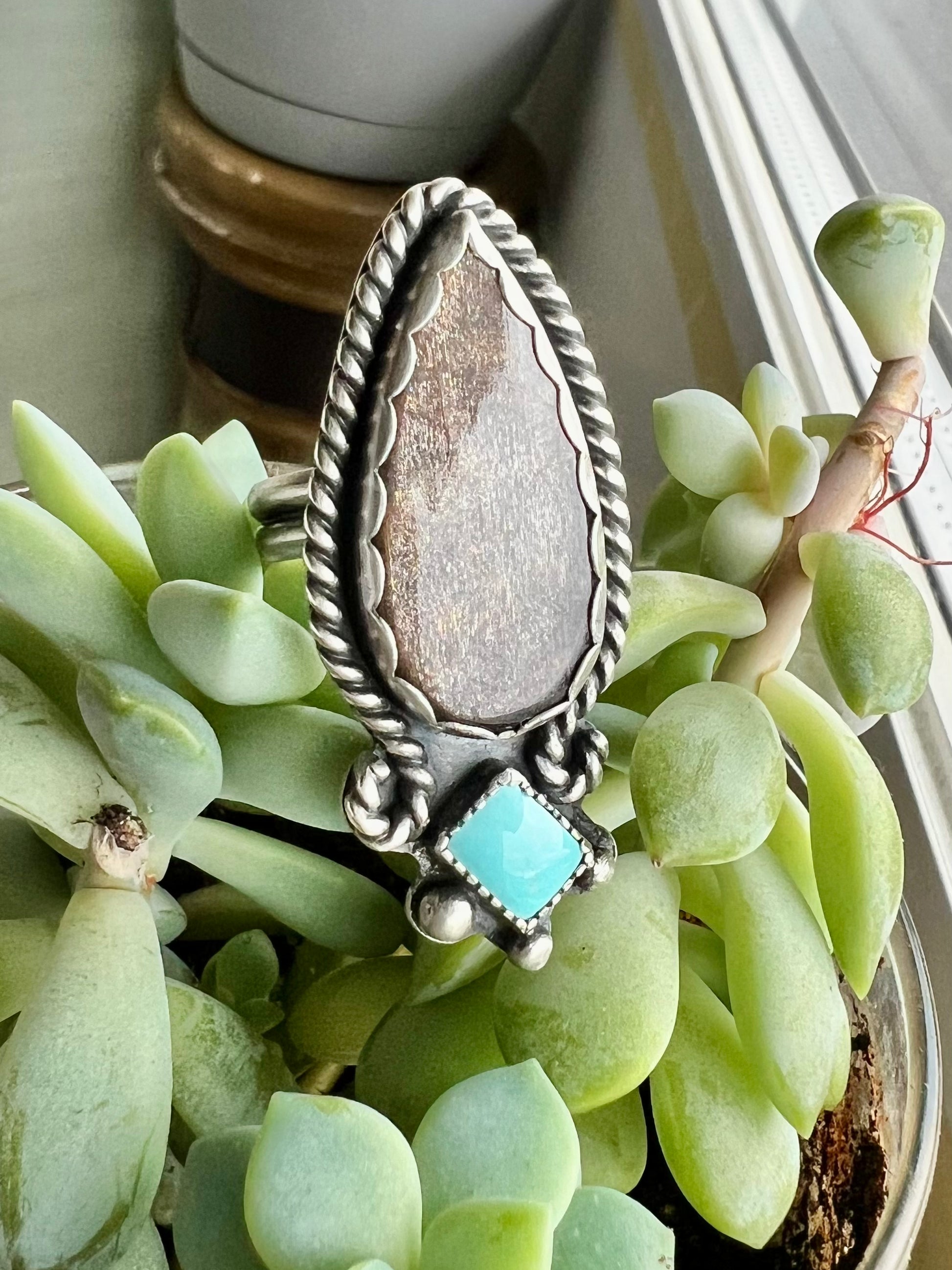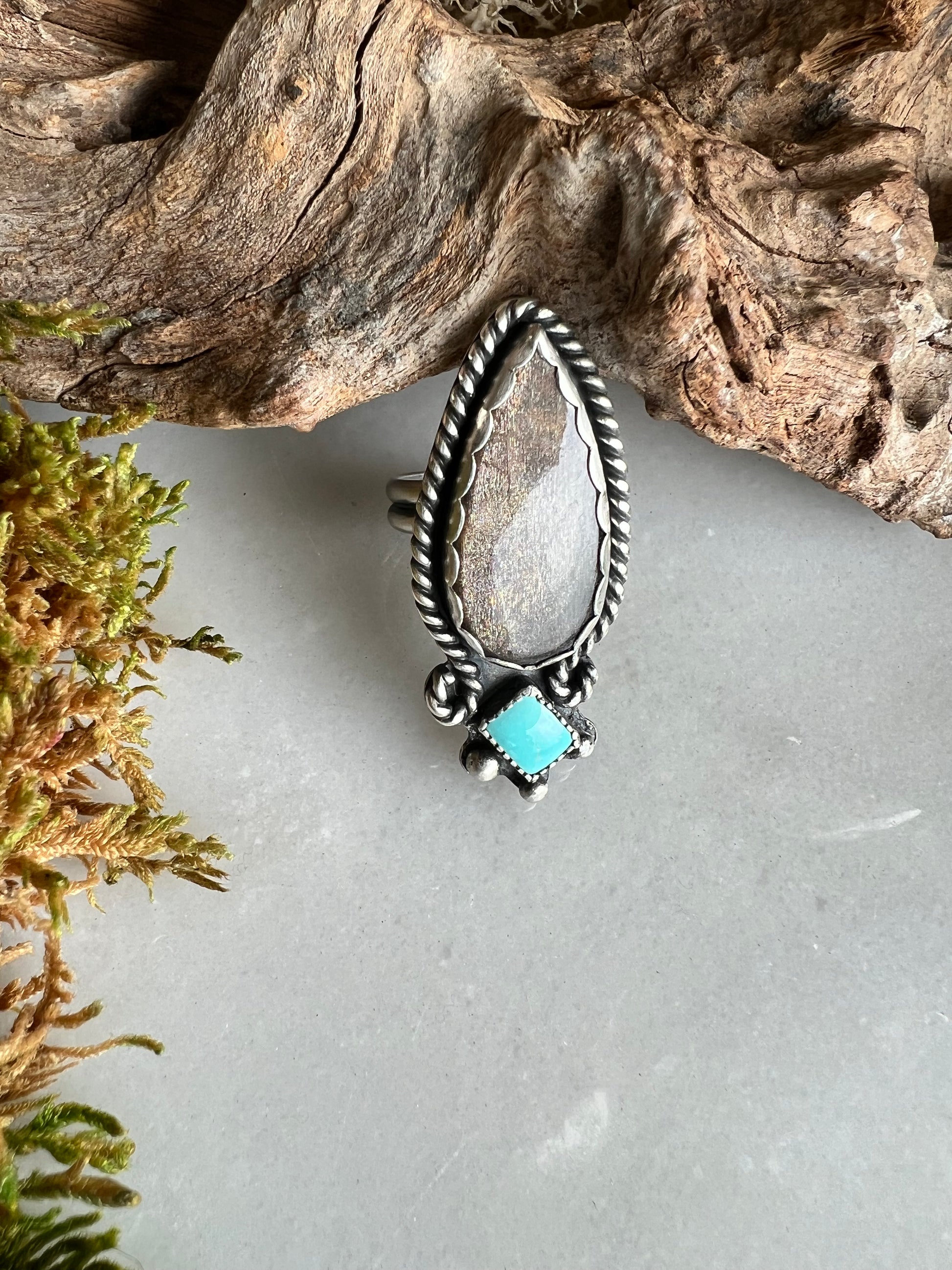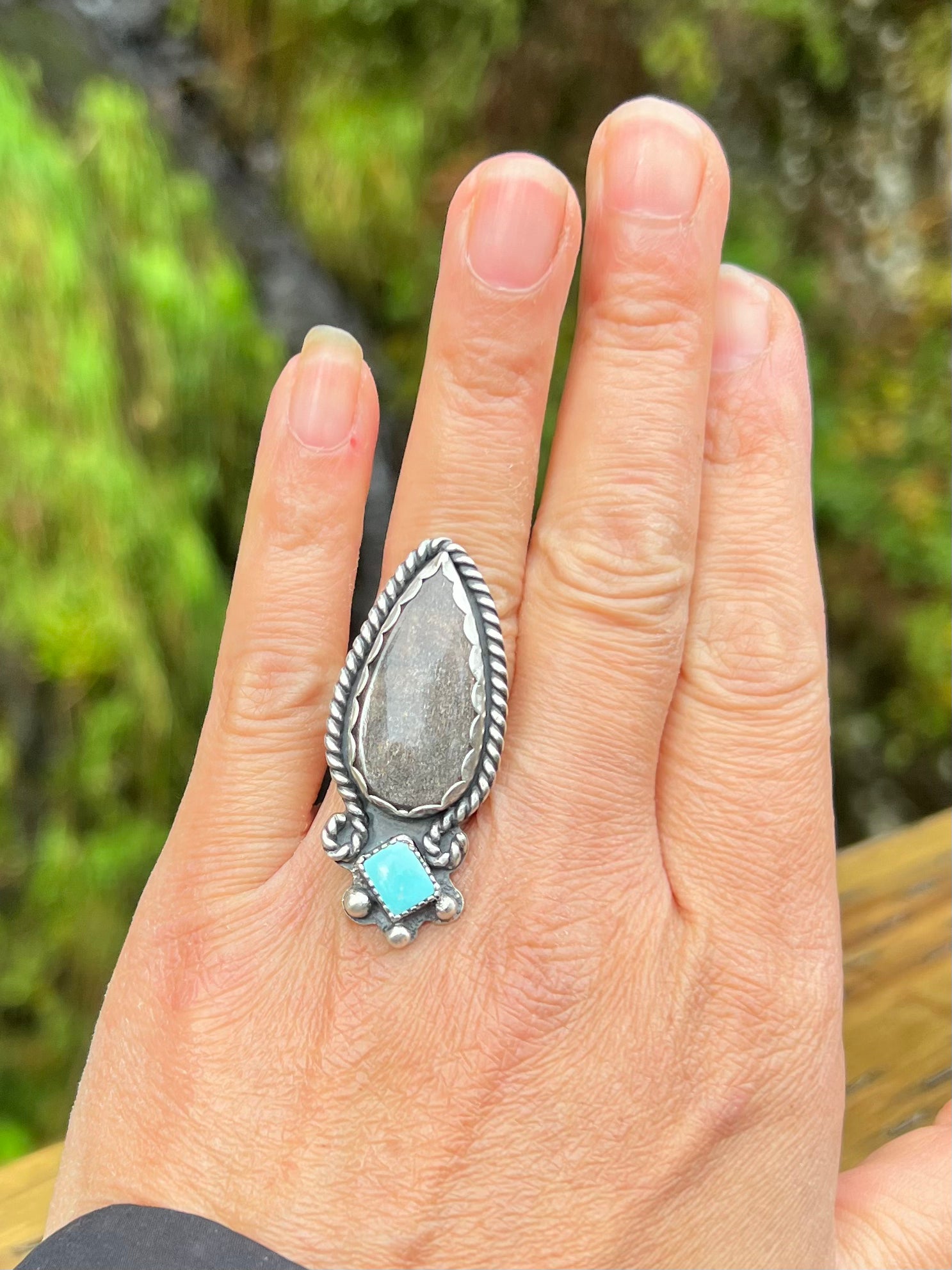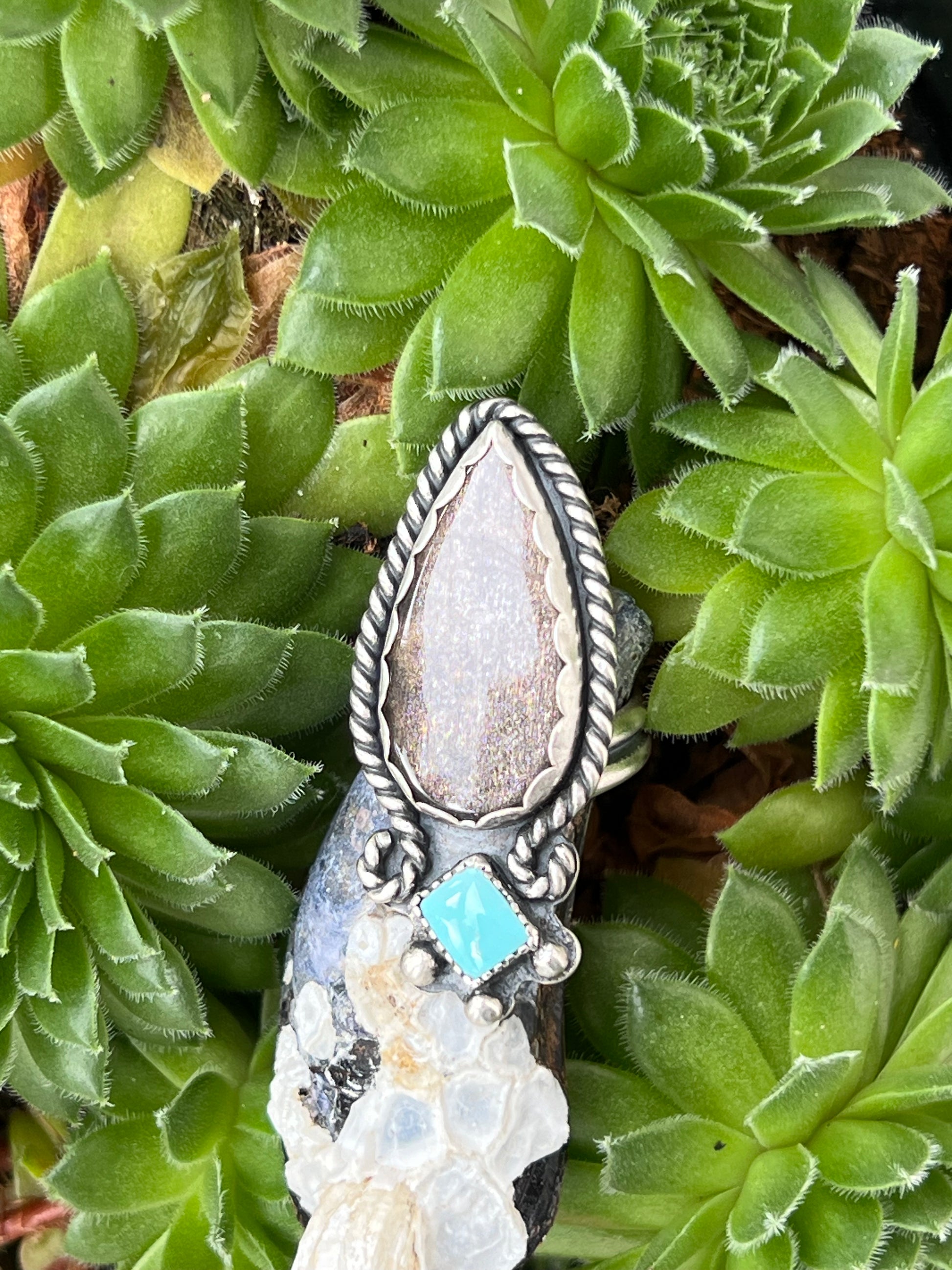 Like a starlit desert night, this exquisite piece features a beautiful African Moonstone at its center, shimmering with a golden and copper flash. The moonstone's rugged beauty is complemented by a tiny lone mountain turquoise, adding a touch of serene blue to the earthy neutral tones. This ring's subtle edgy look makes it effortlessly versatile, matching any color or style. The combination of these natural stones creates a unique and elegant accessory, perfect for enhancing any outfit with its captivating charm. Handcrafted sterling silver with a satin oxidized finish. With an adjustable size ring band.