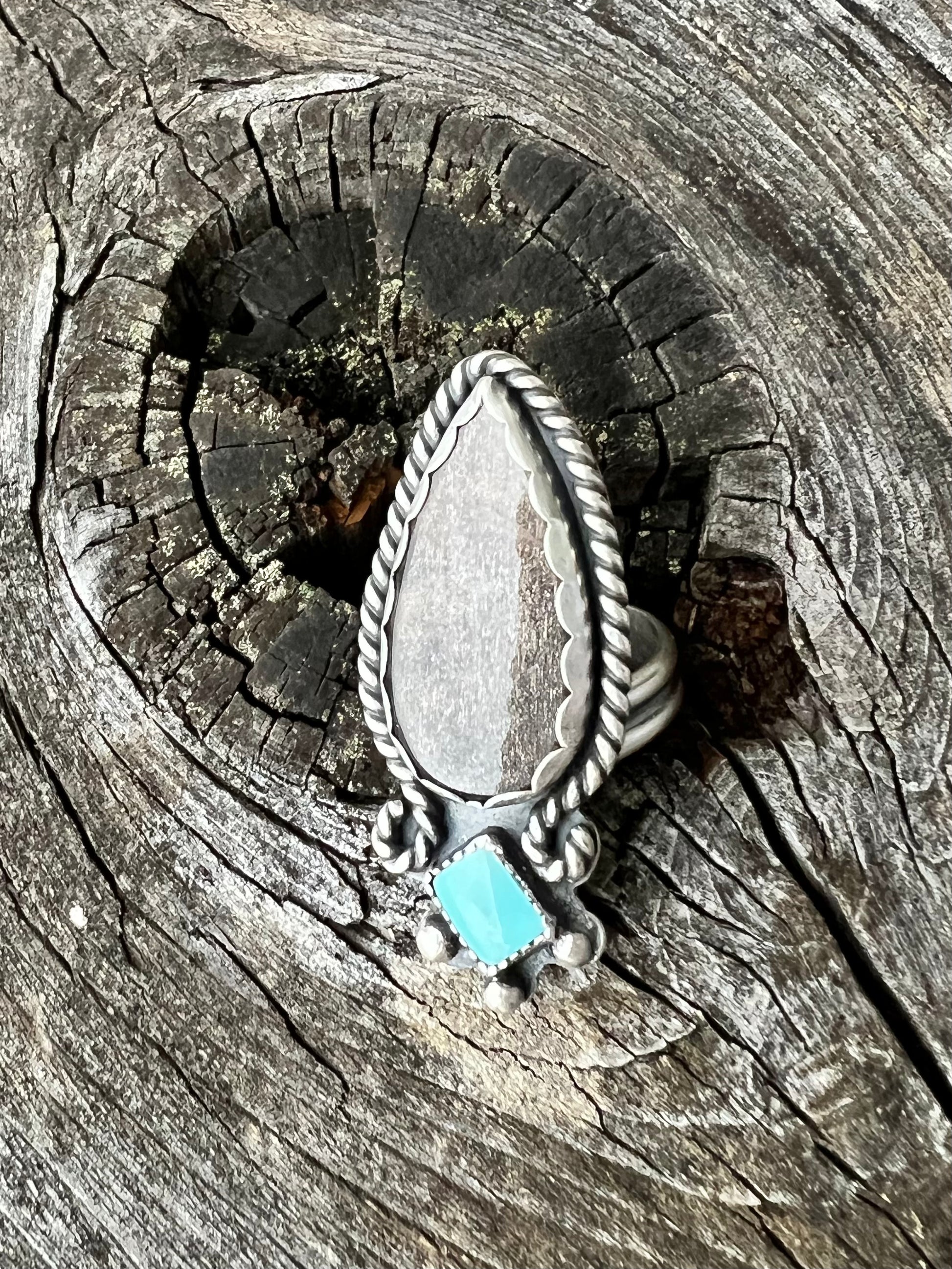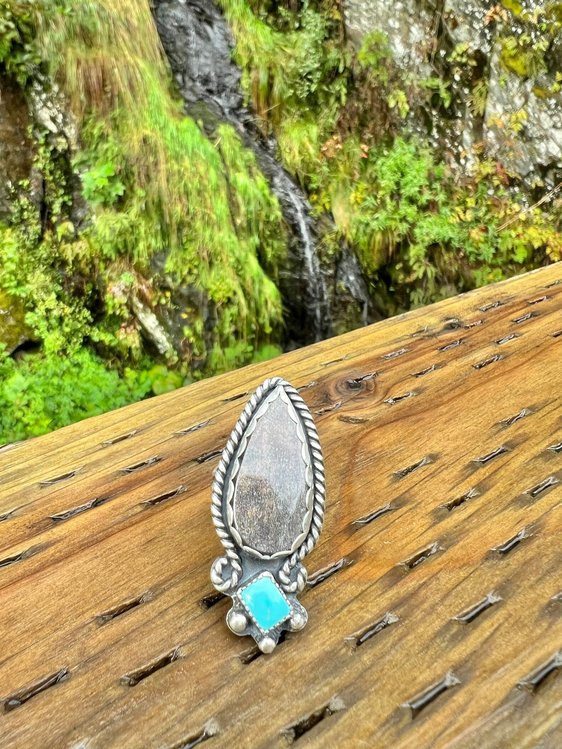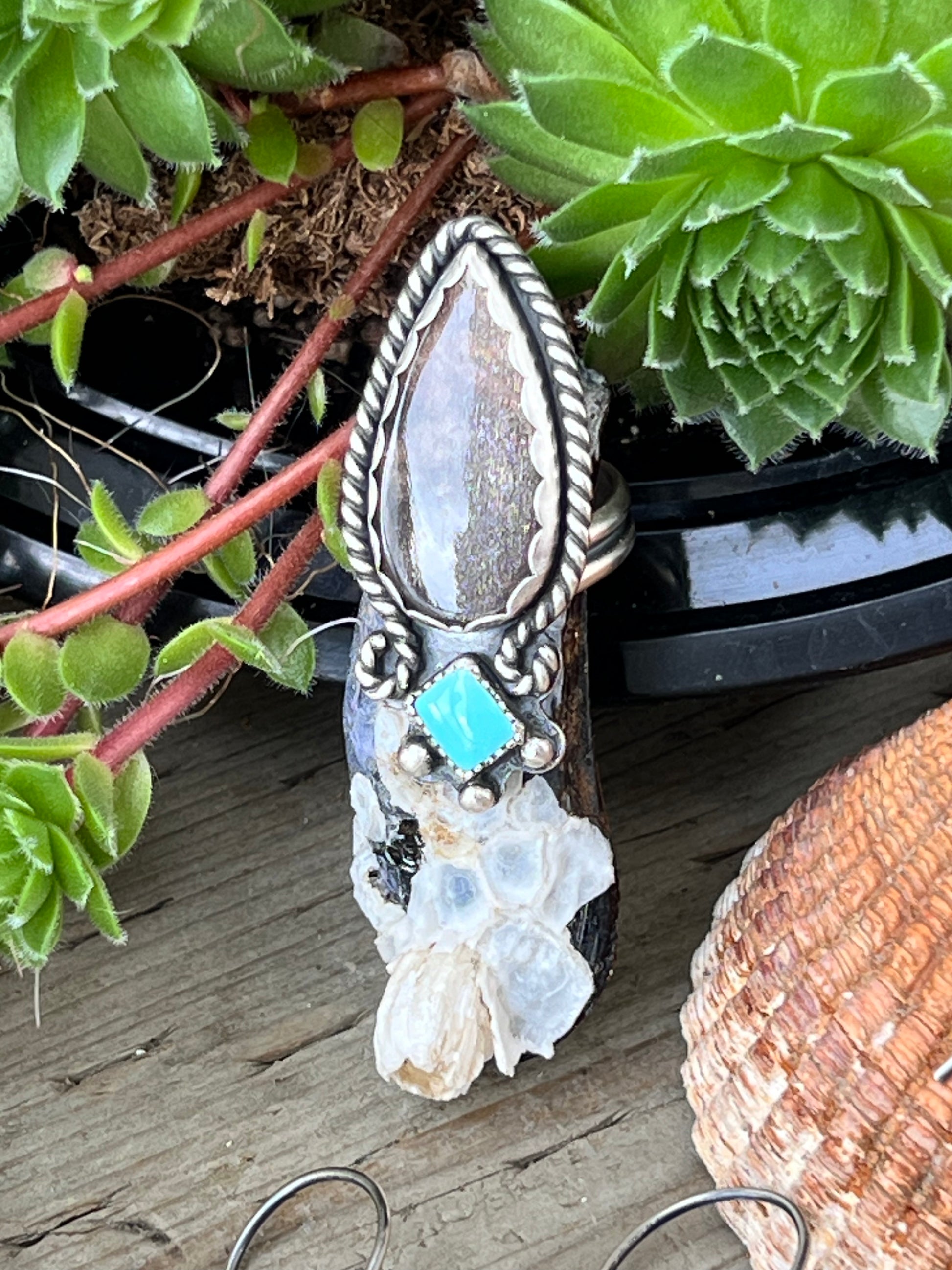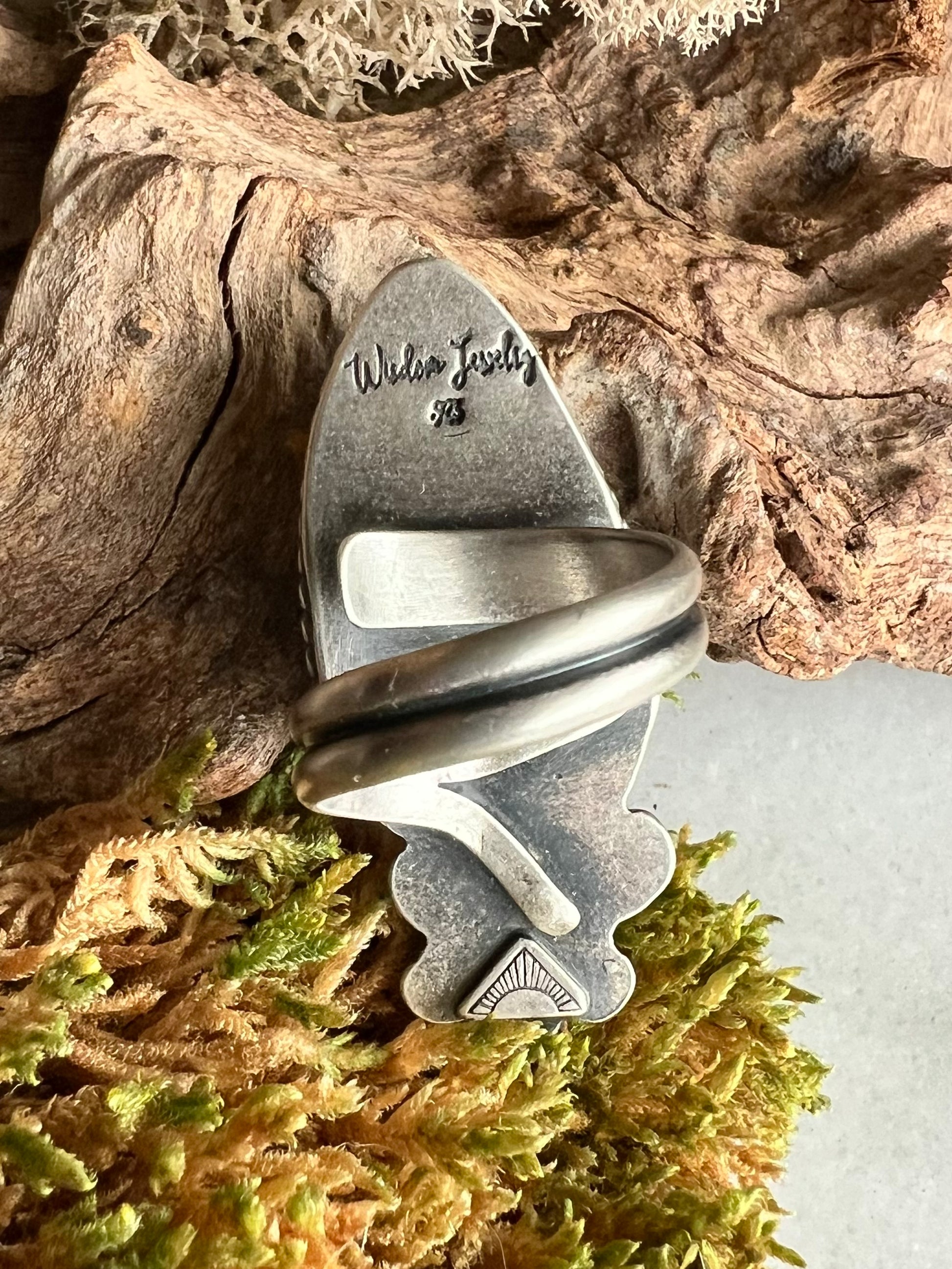 Like a starlit desert night, this exquisite piece features a beautiful African Moonstone at its center, shimmering with a golden and copper flash. The moonstone's rugged beauty is complemented by a tiny lone mountain turquoise, adding a touch of serene blue to the earthy neutral tones. This ring's subtle edgy look makes it effortlessly versatile, matching any color or style. The combination of these natural stones creates a unique and elegant accessory, perfect for enhancing any outfit with its captivating charm. Handcrafted sterling silver with a satin oxidized finish. With an adjustable size ring band.