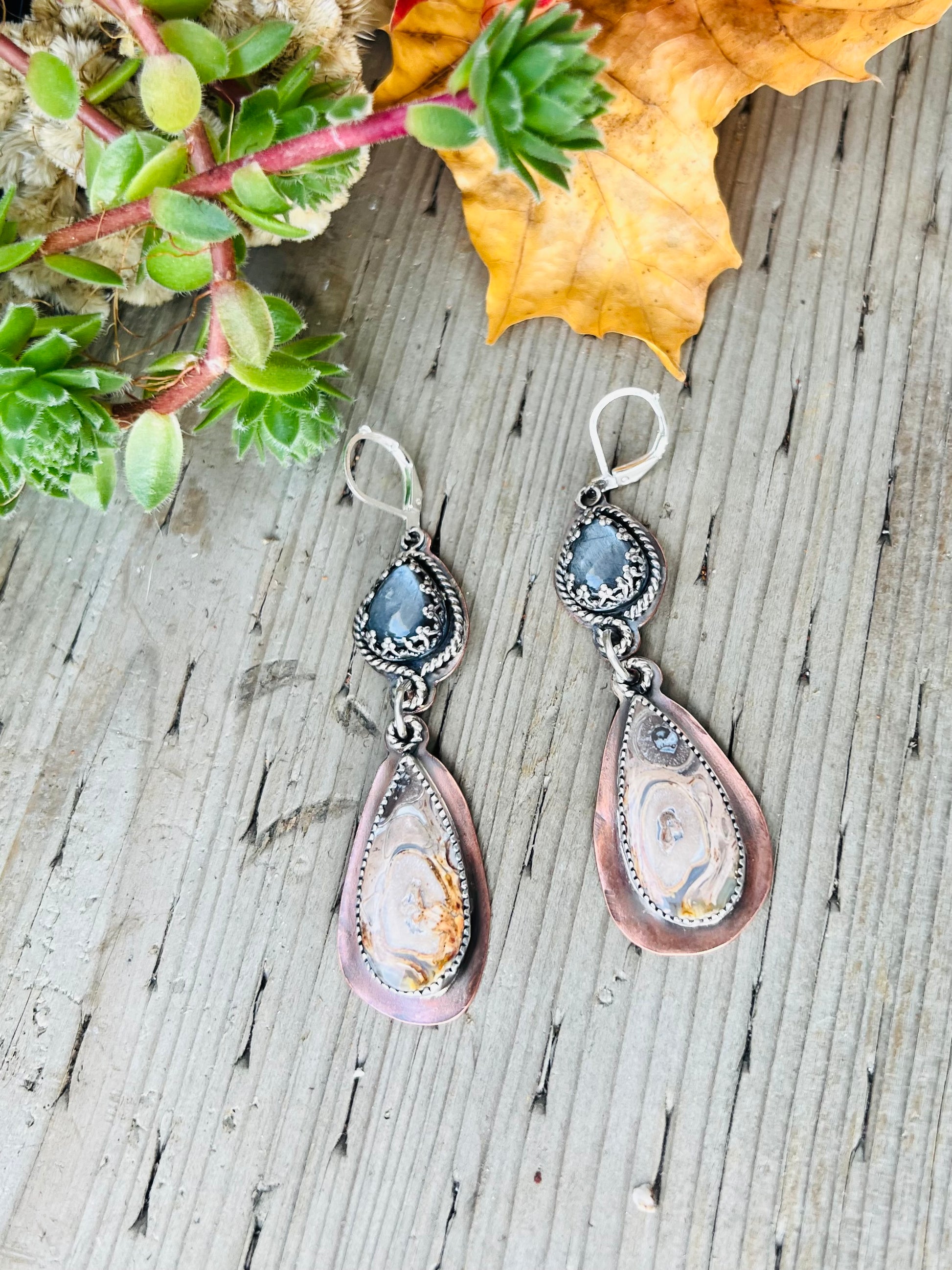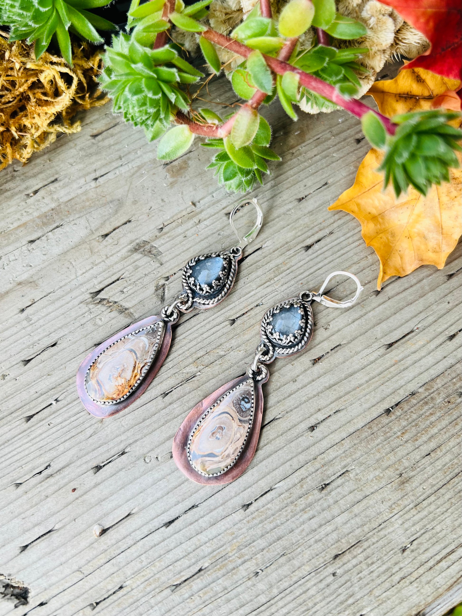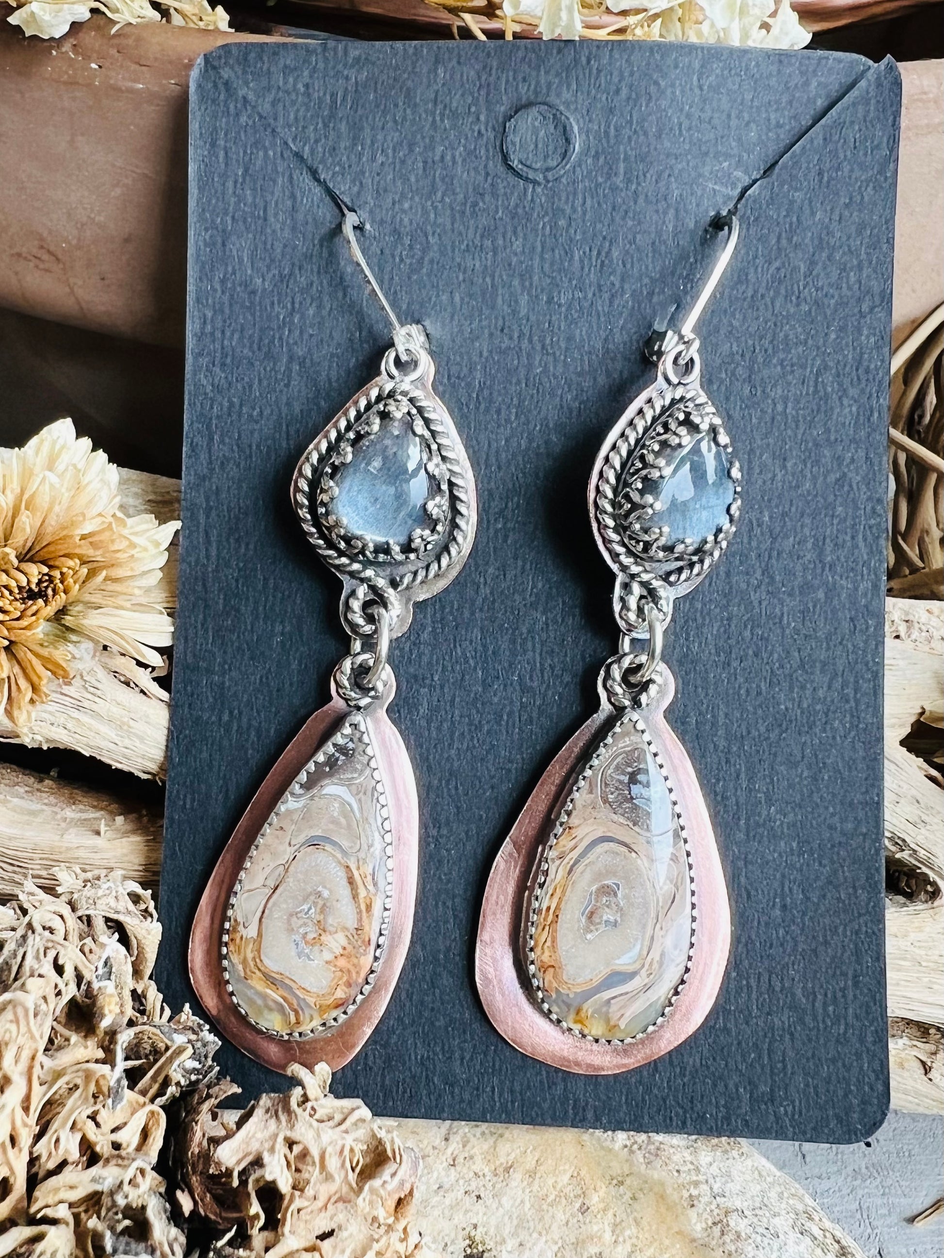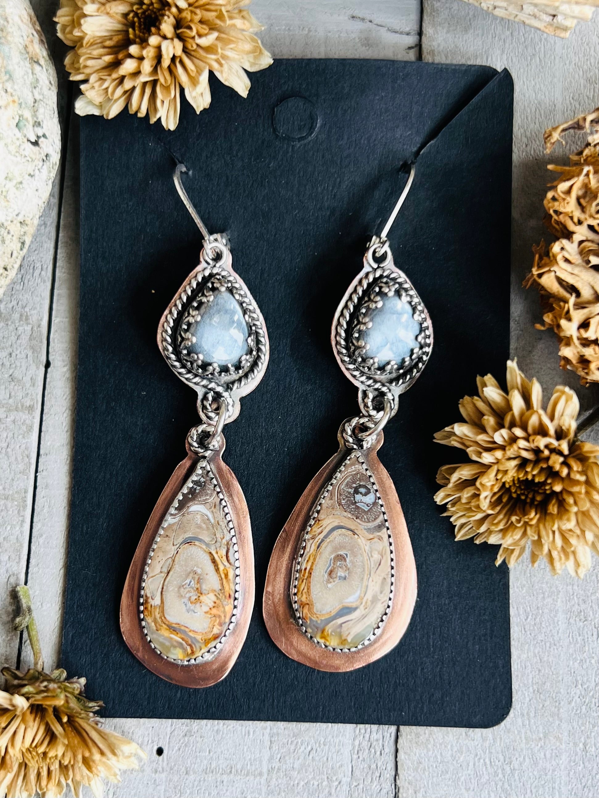 Like celestial maps carved in ancient stone, these earrings evoke starlit nights and forgotten myths. Fossilized Indonesian palm wood, with its intricate grain like natural star charts, pairs with silver moonstones—softly glowing with an ethereal shimmer. Each element is set in handcrafted sterling silver and warm copper, creating a cosmic harmony of earth and sky.